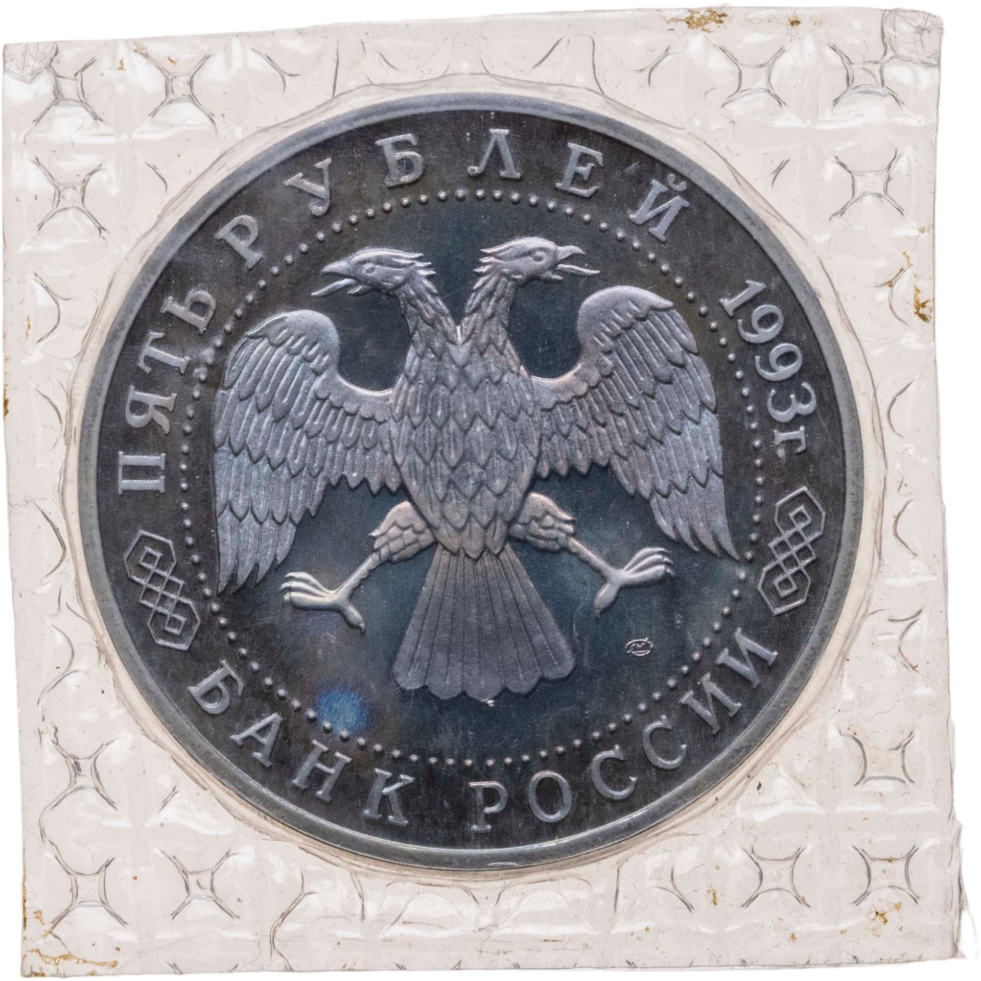 Вверху вдоль канта номинал «ПЯТЬ РУБЛЕЙ» и год выпуска «1993 г.», внизу слова «БАНК РОССИИ». В середине двуглавый орел под ним справа монограмма монетного двора «ЛМД».