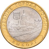 Прежде всего нужно отметить, что серия «Древние города России» выполнена из биметаллического сплава, то есть состоит из двух частей – центр выполнен из мельхиора, а ободок из латунного сплава. На данный момент образы тридцати четырёх городов России отображены в художественном исполнении каждой из монет. Полный перечень экземпляров являет собой внушительный список, мы же с Вами остановимся на одном – посвященном городу Выборг, входящему в состав Ленинградской области. Памятная монета выпущена в 2009 году. Над её созданием трудились скульптор А.Н. Бессонов и народный художник Российской Федерации А. В. Бакланов.