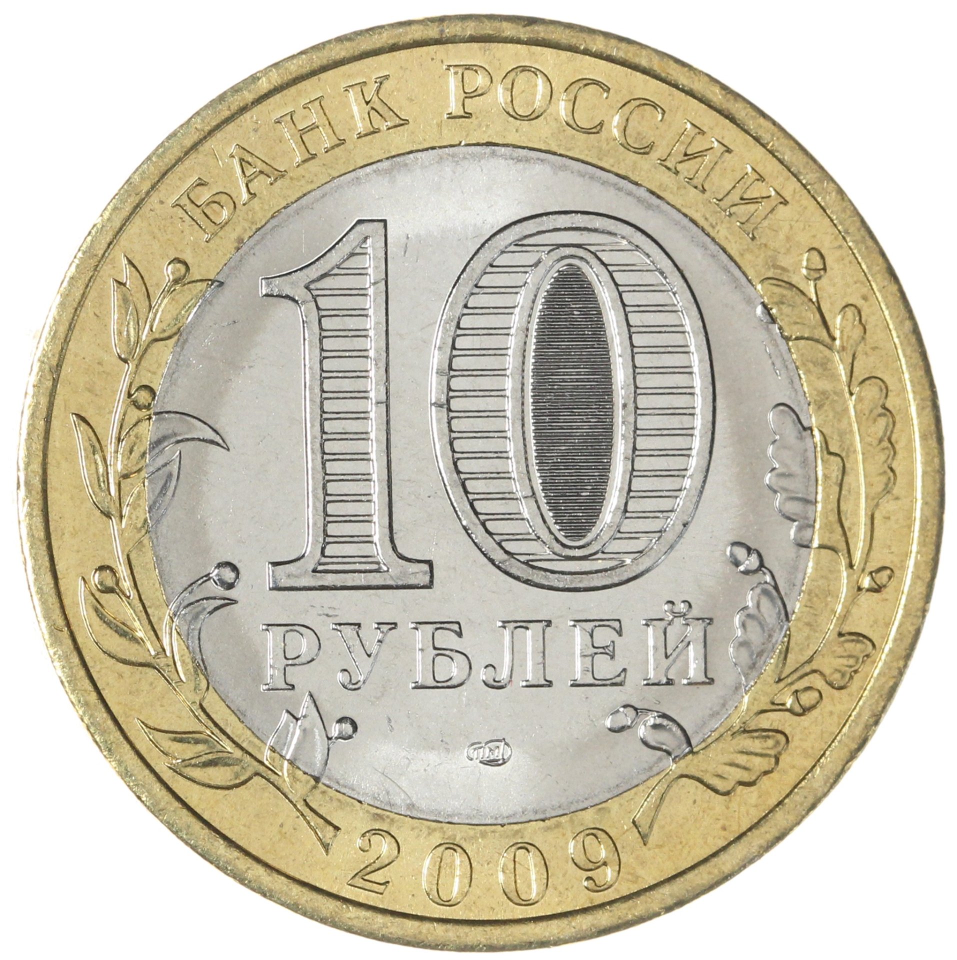 На лицевой стороне – в центре центральной вставки обозначен номинал – 10 рублей. Интересная, характерная и ценная особенность данной монеты — внутри цифры 0 находятся надписи — цифра 10 и слово "руб", их можно разглядеть при попеременном наклоне монеты. В нижней части диска – товарный знак СПМД. На верхней части ободка из латуни присутствует надпись «Банк России», на нижней – дата выпуска монеты – 2009 год. По левую и правую стороны кольца – изображение стилизованного растительного орнамента (слева ветка оливы, справа ветка дуба), переходящее на центральный мельхиоровый диск.
