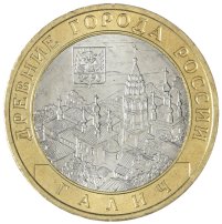 В 2002 году Центральный банк России выпустил в оборот несколько биметаллических монет достоинством 10 рублей из новой серии, которая была названа "Древние города России". Серия уникальна в первую очередь тем, что её список постоянно пополняется, она не ограничена. В среднем в год поступает в обращение 3-4 разновидности. Каждая из них посвящена одному из древних городов России и принадлежащих ей ранее земель. Также отличительная особенность монет в том, что один и тот же вид может одновременно чеканится на обоих монетных дворах — Московском и Санкт-Петербургском. Каждая из монет является биметаллической и, соответственно, состоит из двух частей - центральной вставки из мельхиора и латунного кольца. На данный момент виды сорока одного города России отображены в художественном исполнении каждой из разновидностей. Полный перечень экземпляров являет собой внушительный список, мы же с Вами остановимся на одном – посвященном городу Галич, входящему ныне в состав Костромской области. Памятная монета выпущена в 2009 году. Над её созданием трудились скульптор А.А. Долгополова и художник А. Д. Щаблыкин.