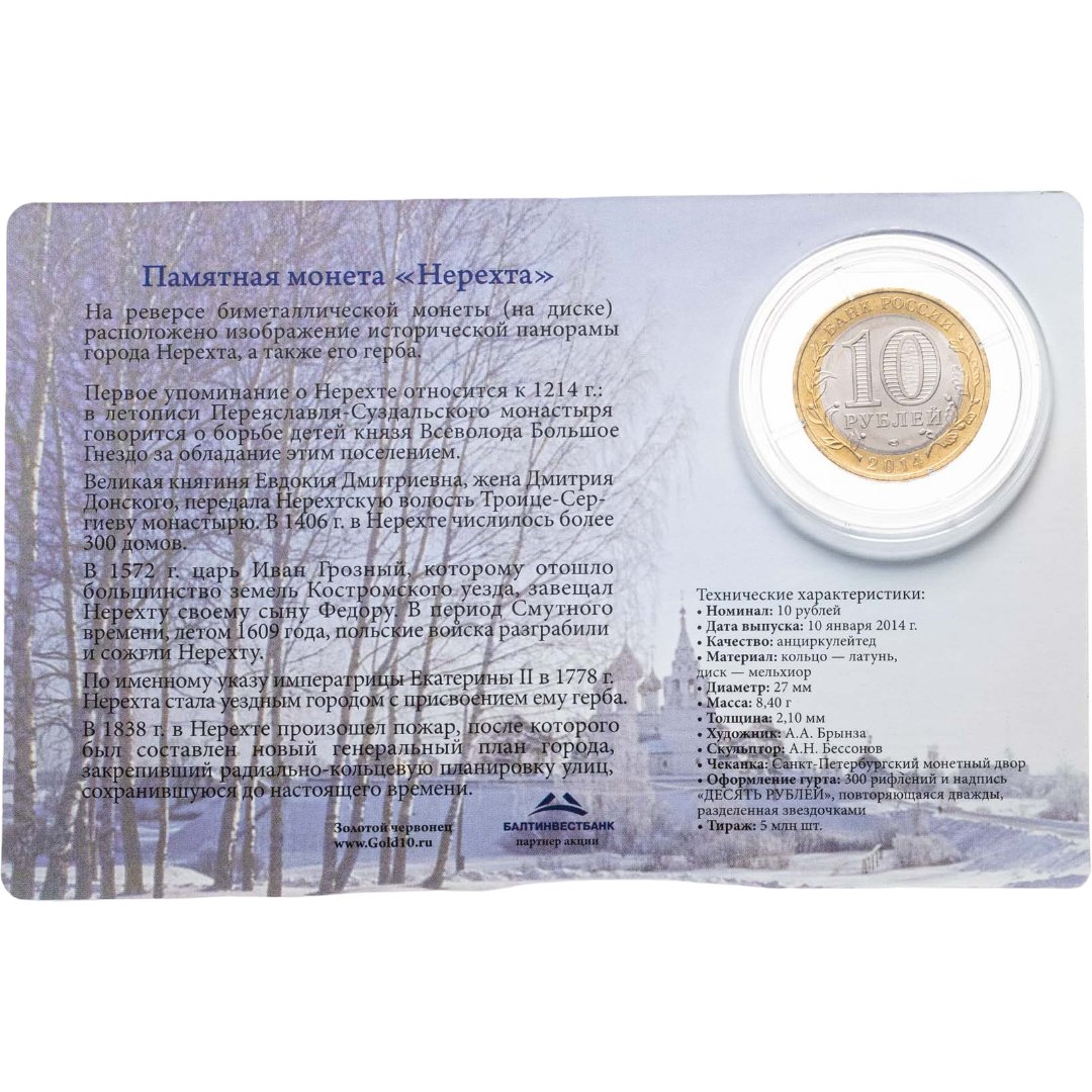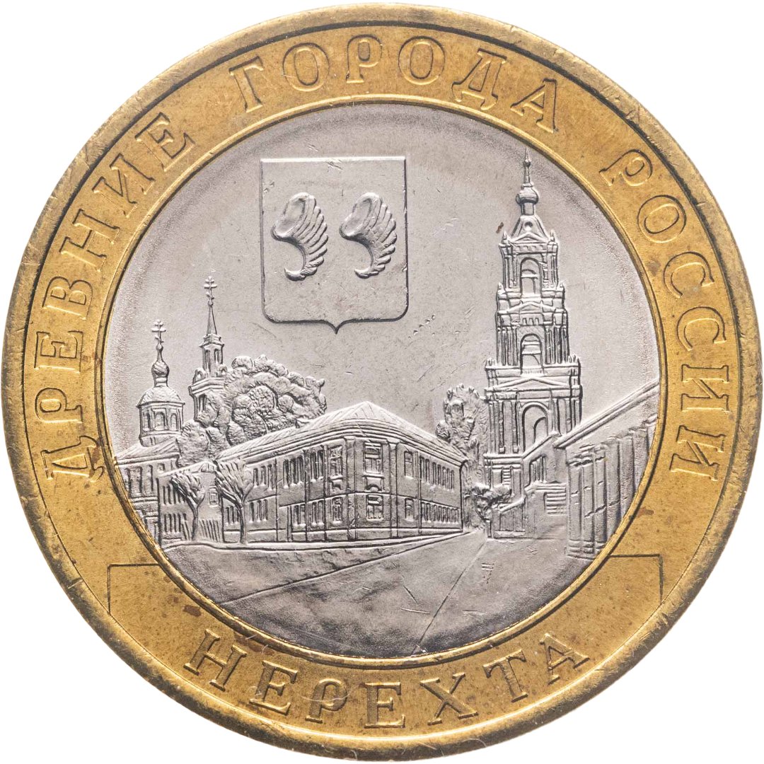 2000 – год выпуска первых двухцветных монет из недрагоценных металлов серии «Древние города России». «Нерехта, Костромская область» 2014 года принадлежит к латунно-мельхиоровой части коллекции. Позже с 2017 года монеты выпускали из стали с латунно-никелевым покрытием.