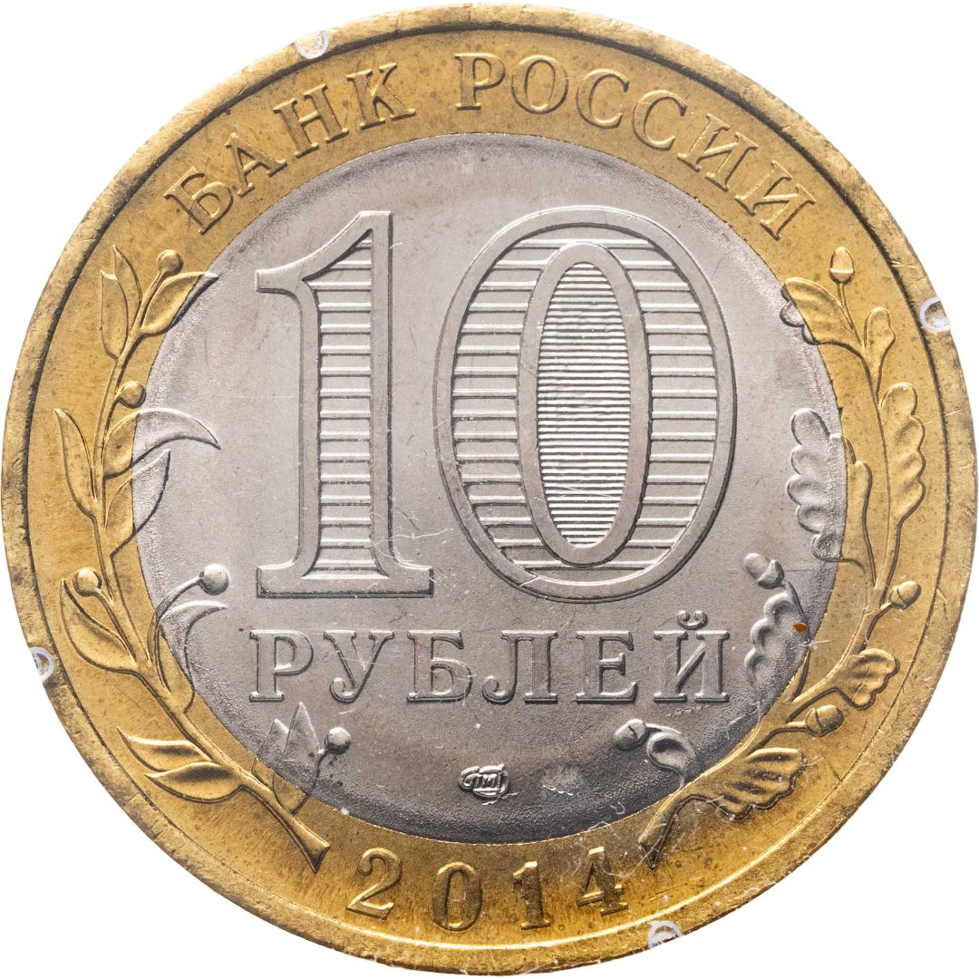 Аверс монеты представляет собой композицию, в которую входит номинал «10 рублей» с защитным элементом в цифре «0», товарный знак, надпись «Банк России», и год выпуска монеты – 2014. Слева и справа – стилизованные мотивы дубовых и лавровых ветвей, символику которых традиционно используют в нумизматике и медальерном искусстве.