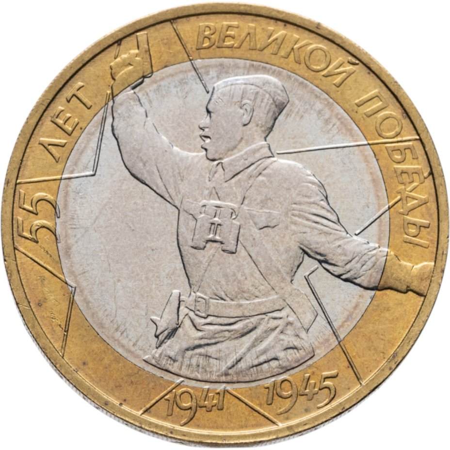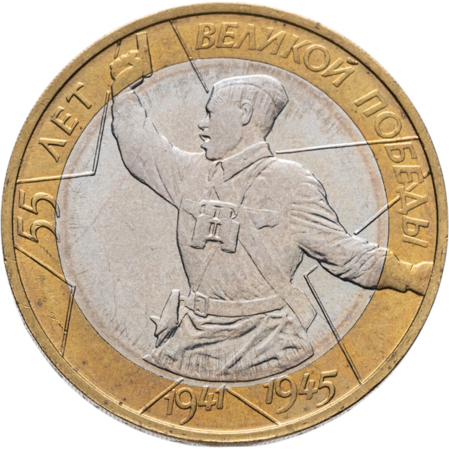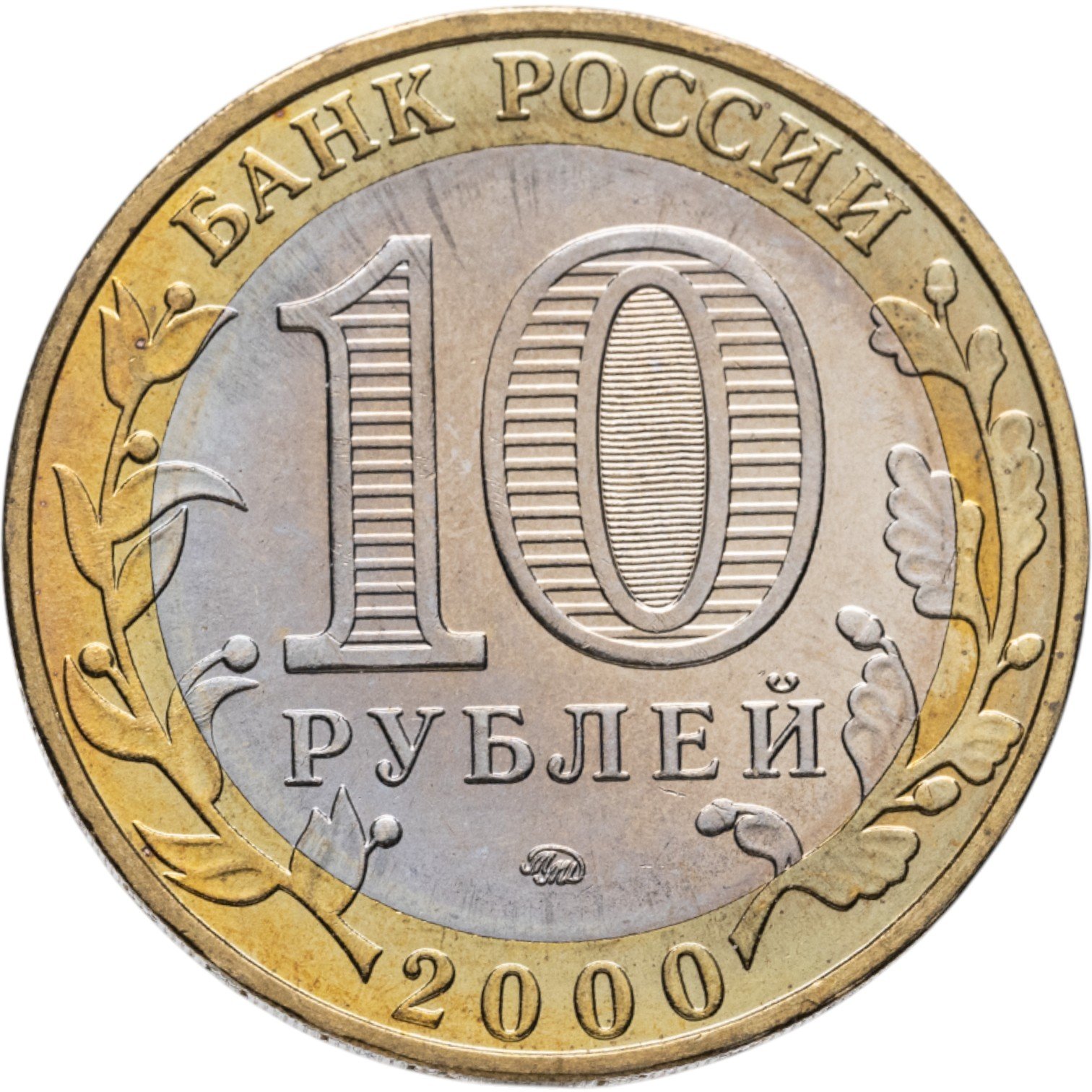 Сверху вдоль края монеты слова «БАНК РОССИИ», внизу год чеканки «2000», слева ветка оливы, справа дуба, обе ветки частично заходят на центральную вставку. В середине номинал «10» под ним слово «РУБЛЕЙ», внутри цифры «0» попеременно видимые при наклоне монеты надписи «10» и «РУБ». Над годом монограмма монетного двора «ММД».