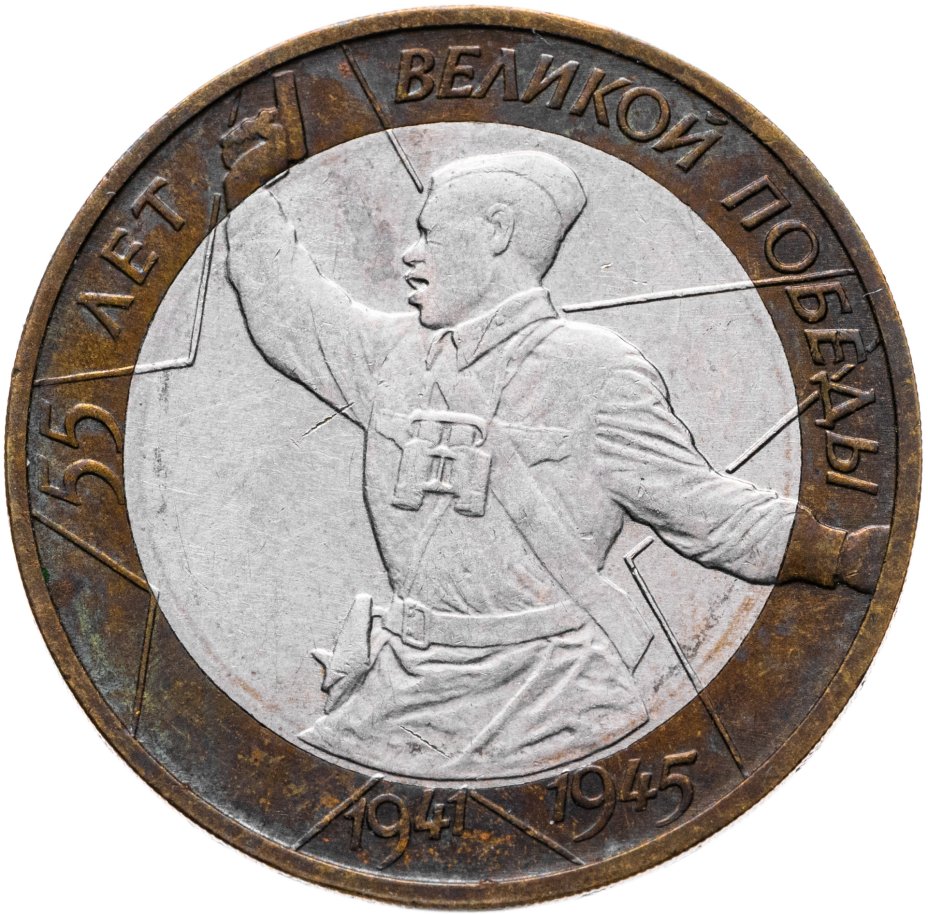 Монета «55 лет Великой Победы» была отчеканена в 200 году на Московском монетном дворе огромным тиражом в 10 млн экземпляров. Это была первая биметаллическая обиходная монета, разработанная в уже новой стране. Сюжетом для создания монеты, которая должна была передать всю боль и героизм нации, стал подвиг Алексея Ерёменко.