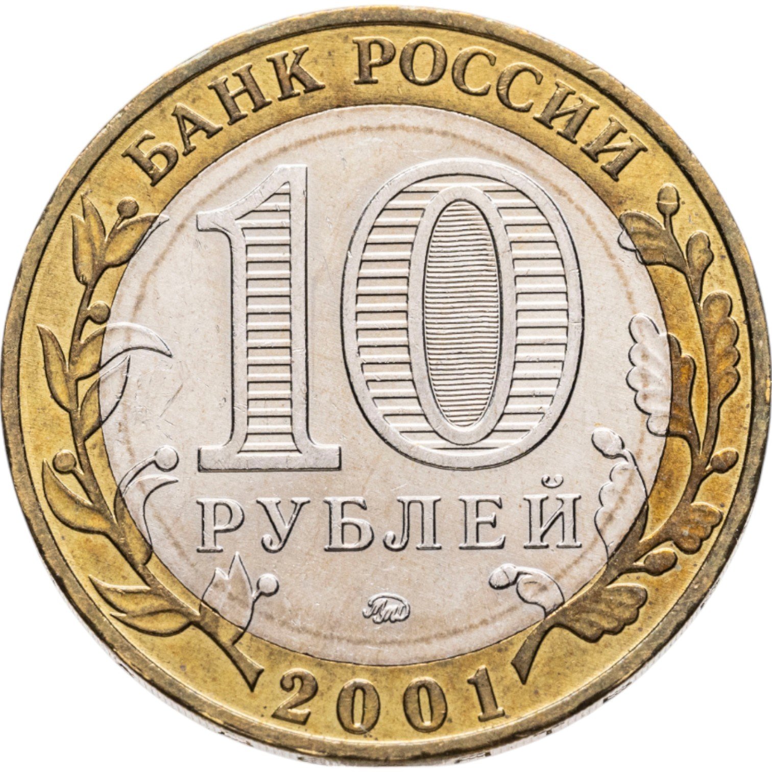 Сверху вдоль края монеты слова «БАНК РОССИИ», внизу год выпуска «2001», слева лавровая ветвь, справа дубовая, обе ветви частично заходят на центральную вставку. В середине номинал монеты «10 РУБЛЕЙ», внутри цифры «0» попеременно видимые при наклоне монеты надписи «10» и «РУБЛЕЙ».