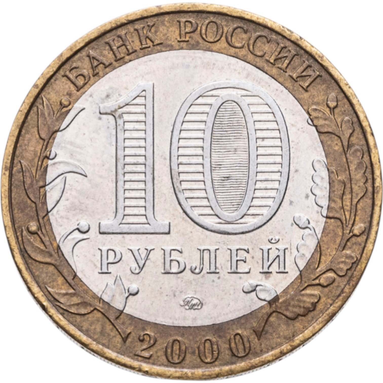 Сверху вдоль края монеты слова «БАНК РОССИИ», внизу год чеканки «2000», слева ветка оливы, справа дуба, обе ветки частично заходят на центральную вставку. В середине номинал «10» под ним слово «РУБЛЕЙ», внутри цифры «0» попеременно видимые при наклоне монеты надписи «10» и «РУБ». Над годом монограмма монетного двора «ММД».