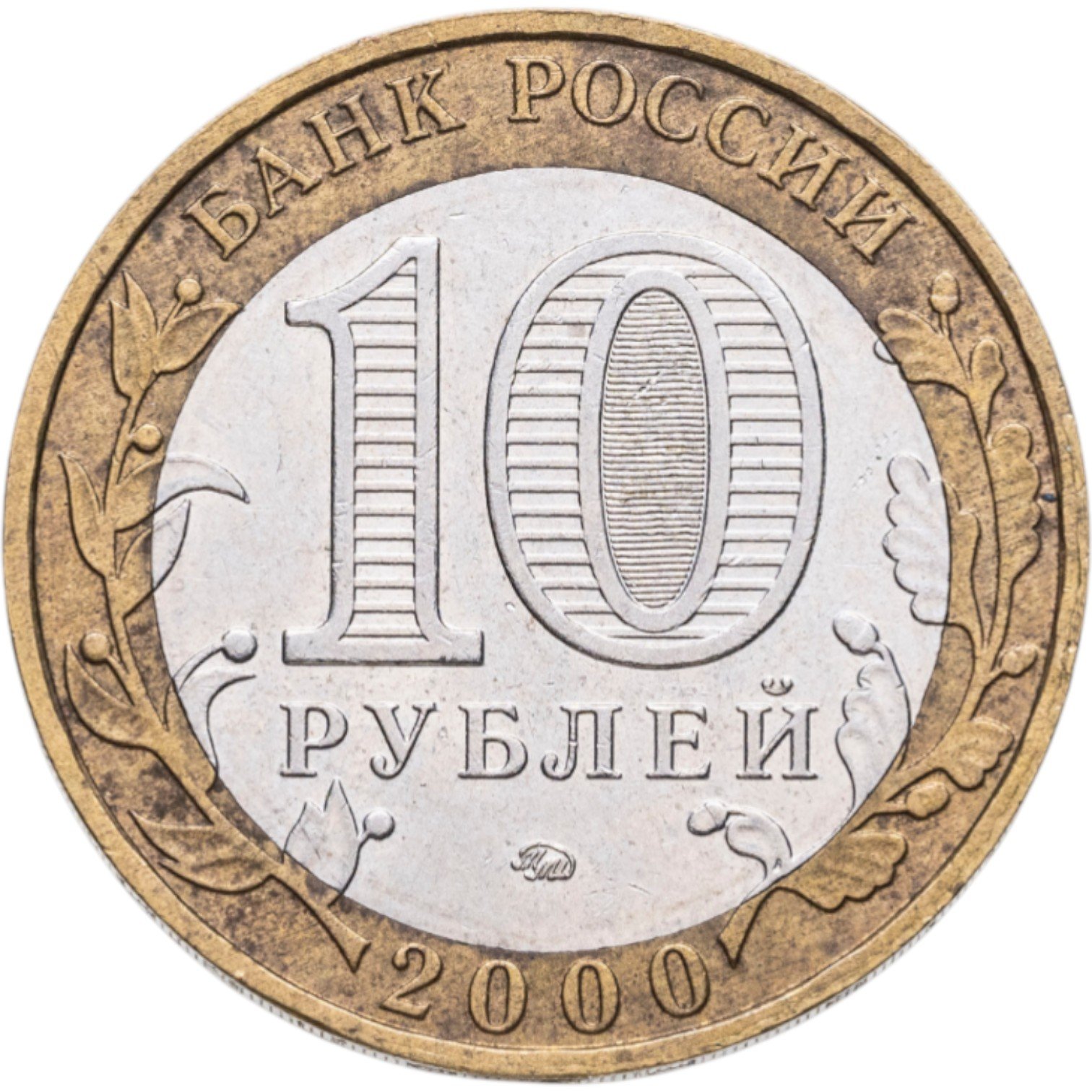 Сверху вдоль края монеты слова «БАНК РОССИИ», внизу год чеканки «2000», слева ветка оливы, справа дуба, обе ветки частично заходят на центральную вставку. В середине номинал «10» под ним слово «РУБЛЕЙ», внутри цифры «0» попеременно видимые при наклоне монеты надписи «10» и «РУБ». Над годом монограмма монетного двора «ММД».