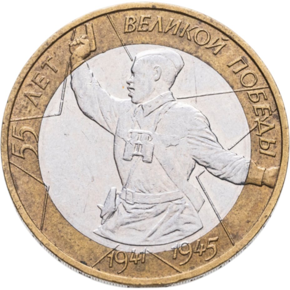 Монета «55 лет Великой Победы» была отчеканена в 200 году на Московском монетном дворе огромным тиражом в 10 млн экземпляров. Это была первая биметаллическая обиходная монета, разработанная в уже новой стране. Сюжетом для создания монеты, которая должна была передать всю боль и героизм нации, стал подвиг Алексея Ерёменко.