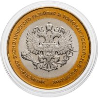 Мы предлагаем купить юбилейную монету 10 рублей, посвящённую Министерству экономического развития и торговли. На реверсе монеты изображён орёл - символ Российской Федерации. В левой лапе он держит рог изобилия, а в правой - кадуцей.