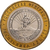 Биметаллические монеты – гордость и радость любого коллекционера. Несмотря на «неблагородное» происхождение – выполненные из латуни (кольцо) и мельхиора (диск), эти монеты отличает особый шарм. «Республика Адыгея» выпущена в 2009 году тиражом 5 млн экземпляров.