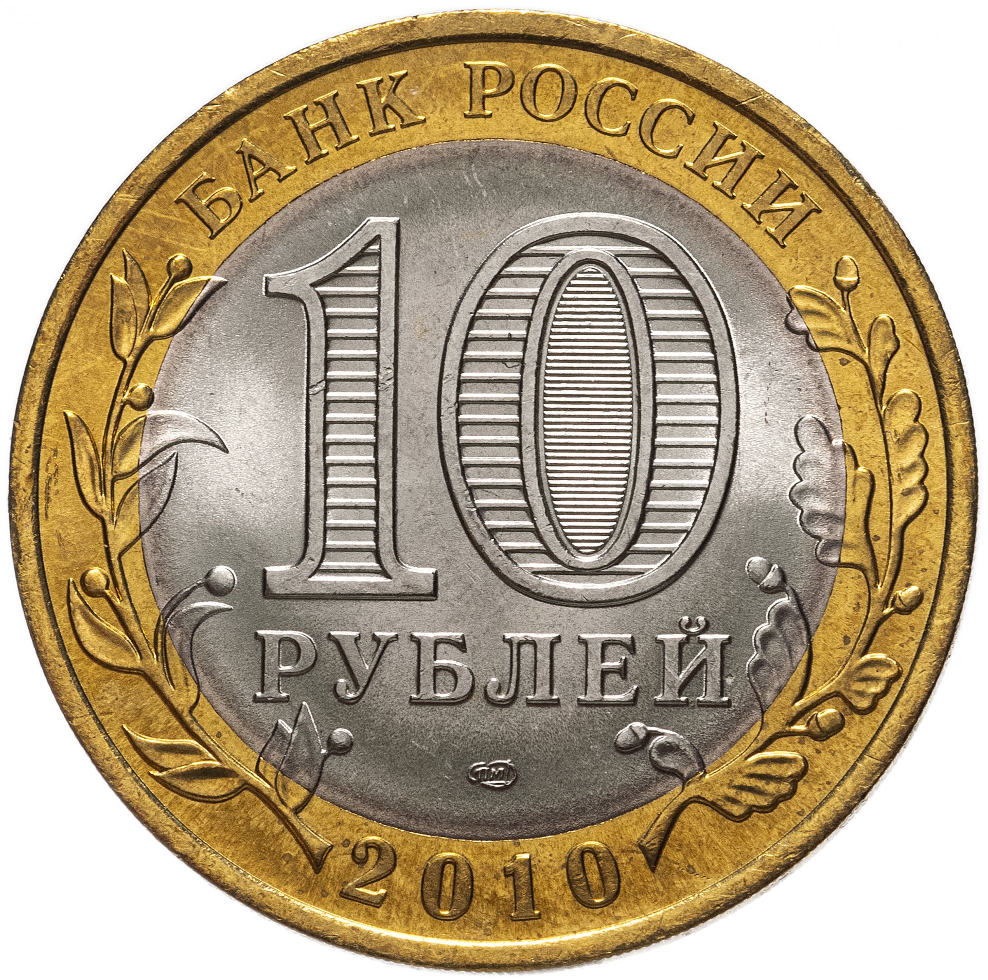 Аверс монеты стандартный. Колосья листьев ветвятся на латунном кольце и слегка задевают диск мельхиора. Верхние их части замирают возле эмитента, нижние окружают год выпуска. В середине — большое, на весь диск, число, обозначающее номинал, а под ним указание на денежную систему. Тут есть к чему присмотреться. Например, если монету наклонять под разными углами, можно увидеть во внутренней части нуля номинала попеременно появляющиеся «10» и «руб».
