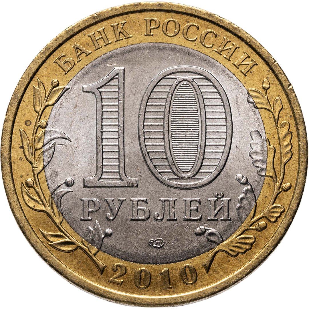 Аверс монеты стандартный. Колосья листьев ветвятся на латунном кольце и слегка задевают диск мельхиора. Верхние их части замирают возле эмитента, нижние окружают год выпуска. В середине — большое, на весь диск, число, обозначающее номинал, а под ним указание на денежную систему. Тут есть к чему присмотреться. Например, если монету наклонять под разными углами, можно увидеть во внутренней части нуля номинала попеременно появляющиеся «10» и «руб».