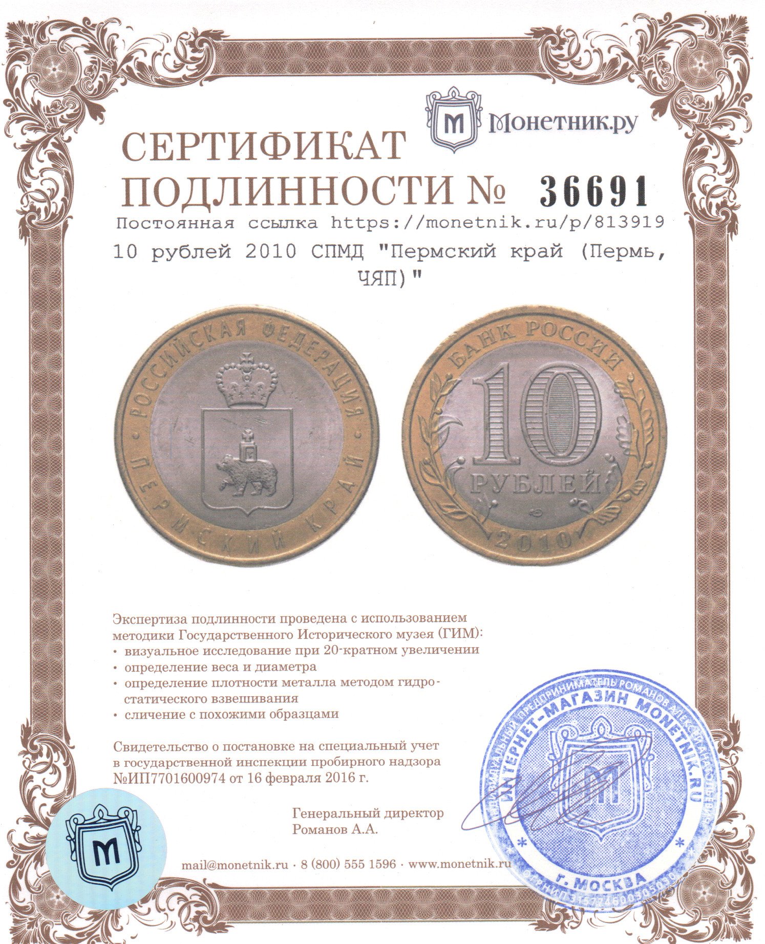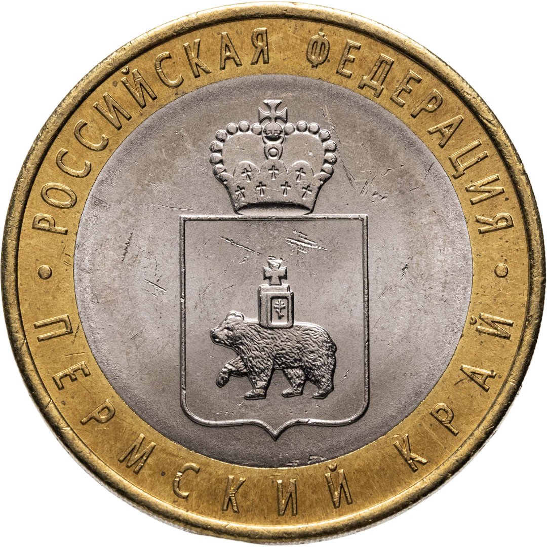 Биметаллическая монета «Пермский край» номиналом десять рублей была выпущена 1 июля 2010 года, в один день с «Ненецким автономным округом». Однако если НАО выпустили весомым тиражом почти в 2 млн. экземпляров, то «Пермский край» куда как меньше — всего лишь 200 000 шт.