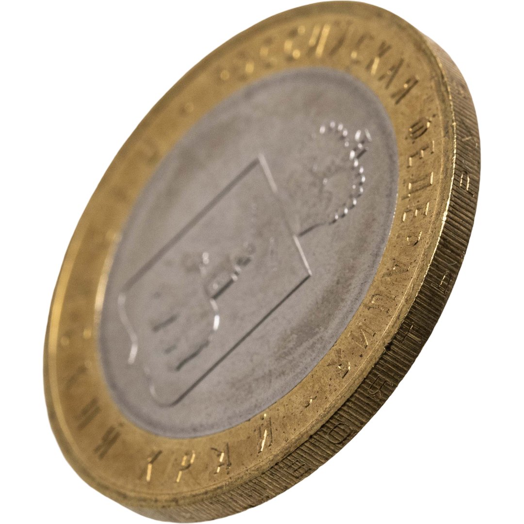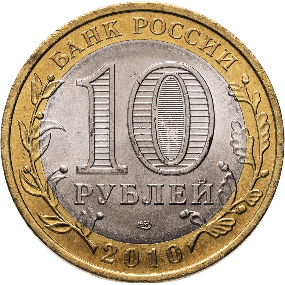 Аверс монеты стандартный. Колосья листьев ветвятся на латунном кольце и слегка задевают диск мельхиора. Верхние их части замирают возле эмитента, нижние окружают год выпуска. В середине — большое, на весь диск, число, обозначающее номинал, а под ним указание на денежную систему. Тут есть к чему присмотреться. Например, если монету наклонять под разными углами, можно увидеть во внутренней части нуля номинала попеременно появляющиеся «10» и «руб».