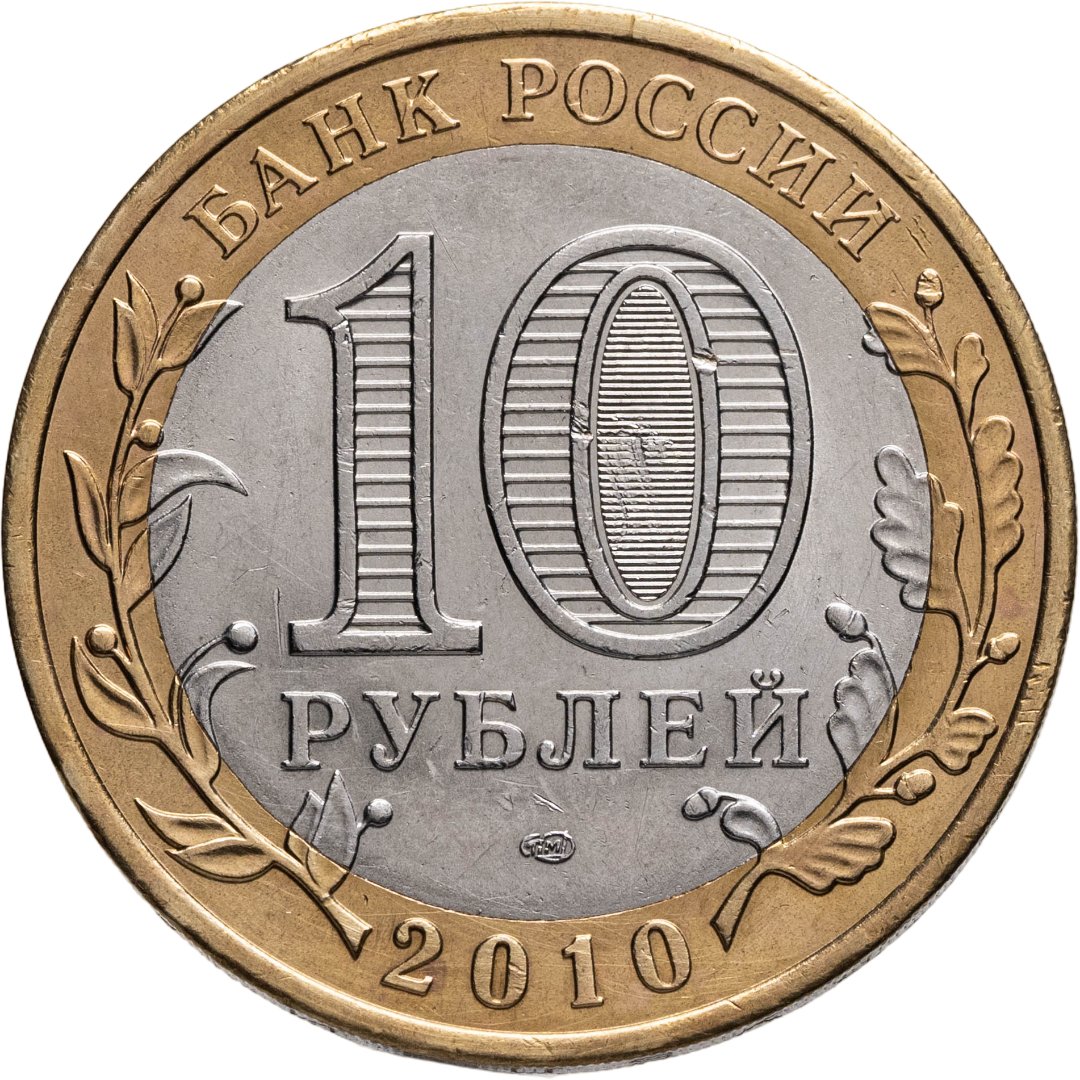 Аверс монеты стандартный. Колосья листьев ветвятся на латунном кольце и слегка задевают диск мельхиора. Верхние их части замирают возле эмитента, нижние окружают год выпуска. В середине — большое, на весь диск, число, обозначающее номинал, а под ним указание на денежную систему. Тут есть к чему присмотреться. Например, если монету наклонять под разными углами, можно увидеть во внутренней части нуля номинала попеременно появляющиеся «10» и «руб».