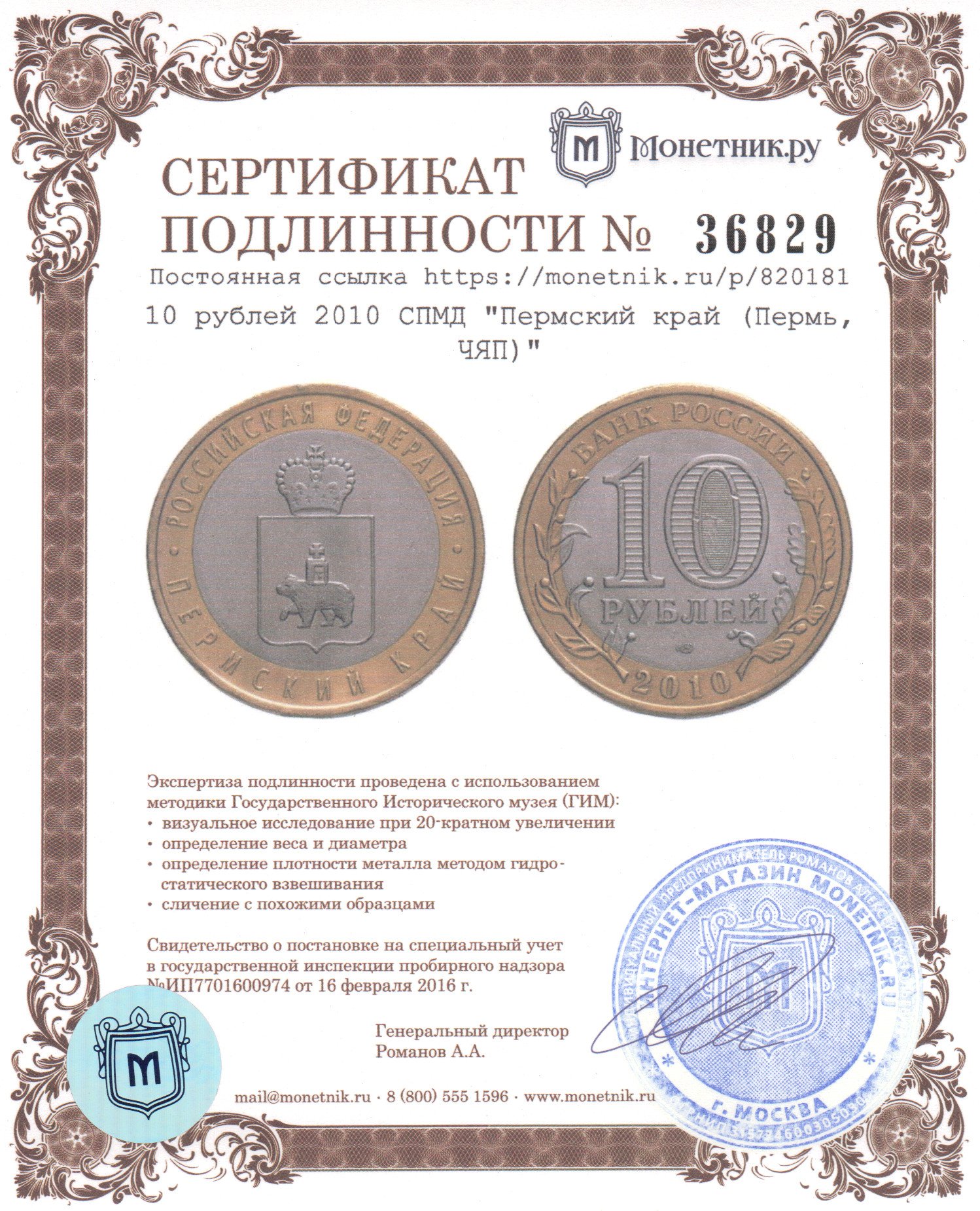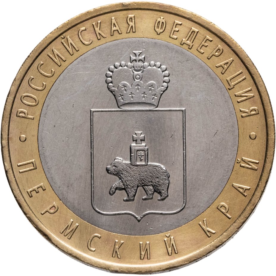 Биметаллическая монета «Пермский край» номиналом десять рублей была выпущена 1 июля 2010 года, в один день с «Ненецким автономным округом». Однако если НАО выпустили весомым тиражом почти в 2 млн. экземпляров, то «Пермский край» куда как меньше — всего лишь 200 000 шт.