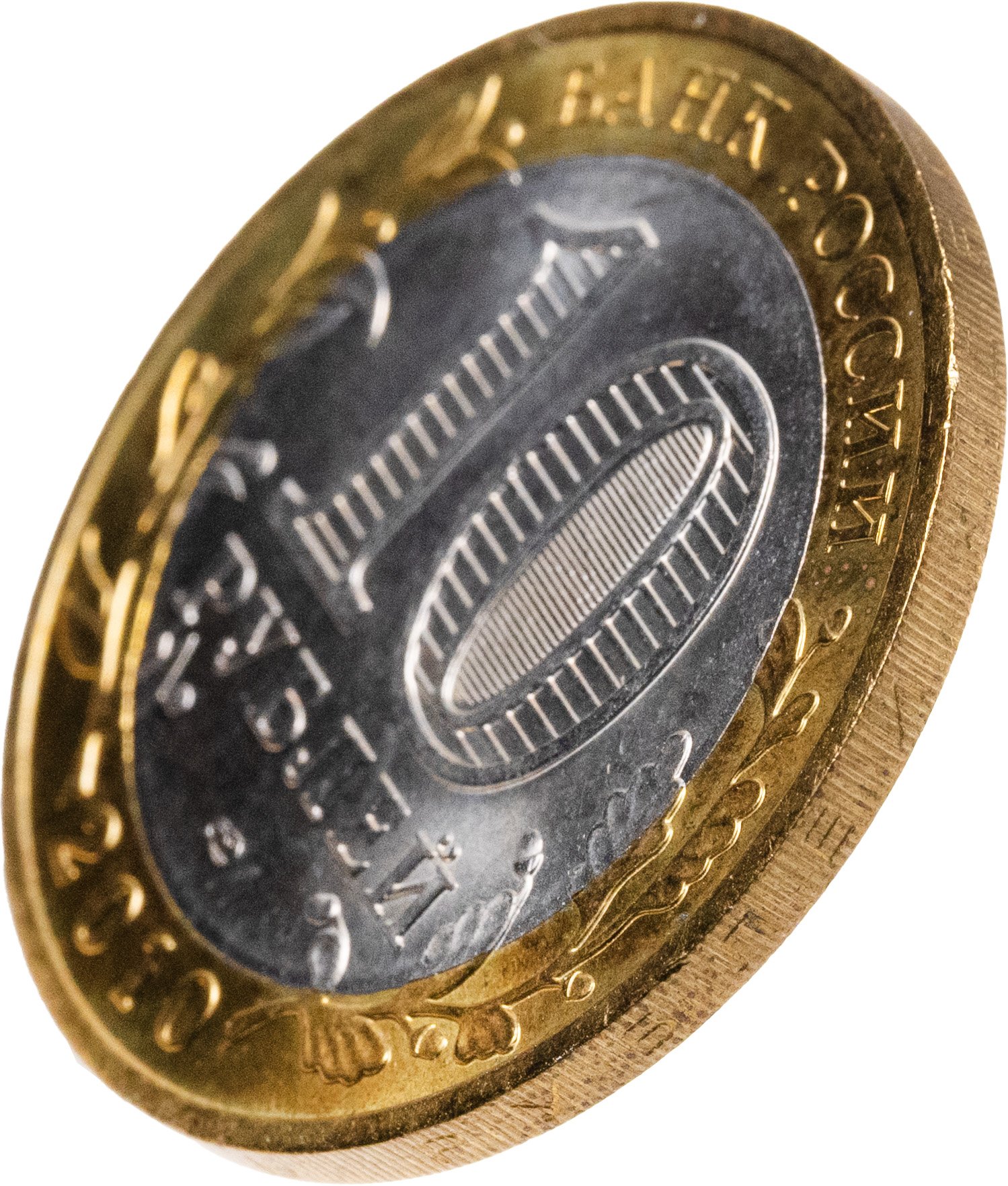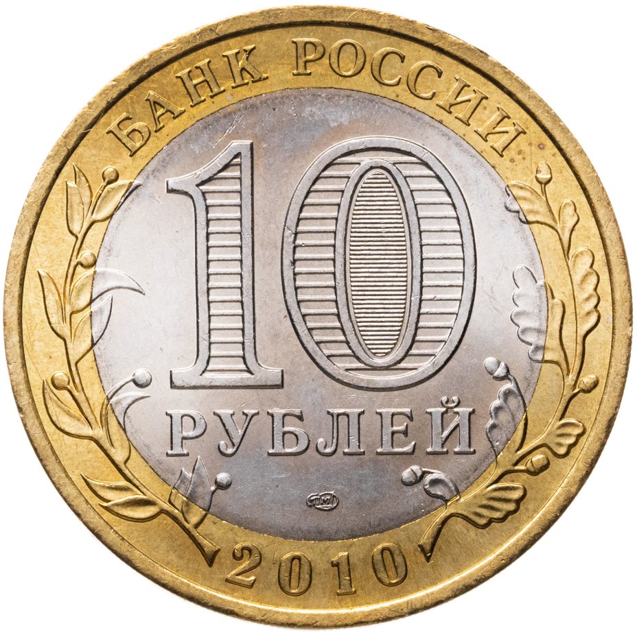 Сверху вдоль края монеты слова «БАНК РОССИИ», внизу год чеканки «2010», слева ветка оливы, справа дуба, обе ветки частично заходят на центральную вставку. В середине номинал «10» под ним слово «РУБЛЕЙ», внутри цифры «0» попеременно видимые при наклоне монеты надписи «10» и «РУБ». Над годом монограмма монетного двора «СПМД».