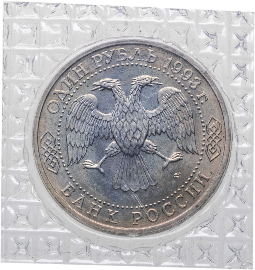 Вверху вдоль канта номинал «ОДИН РУБЛЬ» и год выпуска «1993 г.», внизу слова «БАНК РОССИИ». В середине двуглавый орел под ним справа монограмма монетного двора «ЛМД».
