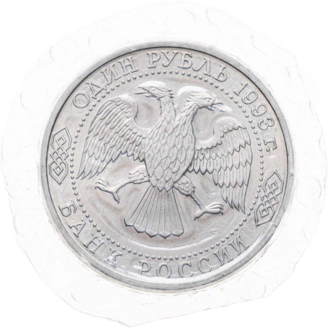Вверху вдоль канта номинал «ОДИН РУБЛЬ» и год выпуска «1993 г.», внизу слова «БАНК РОССИИ». В середине двуглавый орел под ним справа монограмма монетного двора «ЛМД».