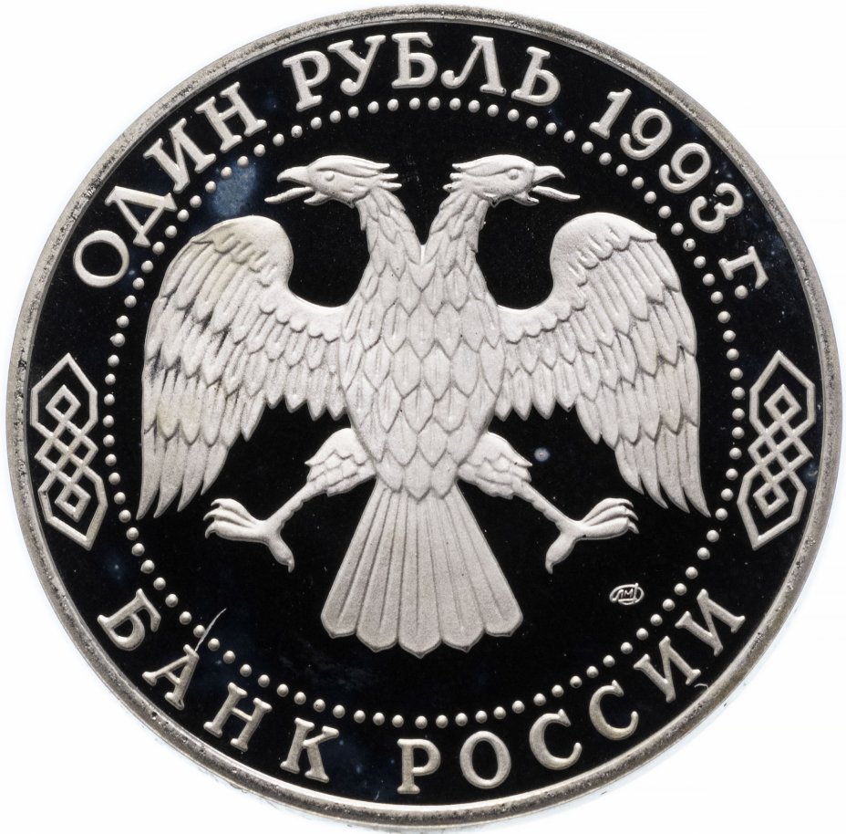 Вверху вдоль канта номинал «ОДИН РУБЛЬ» и год выпуска «1993 г.», внизу слова «БАНК РОССИИ». В середине двуглавый орел под ним справа монограмма монетного двора «ЛМД».