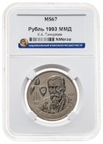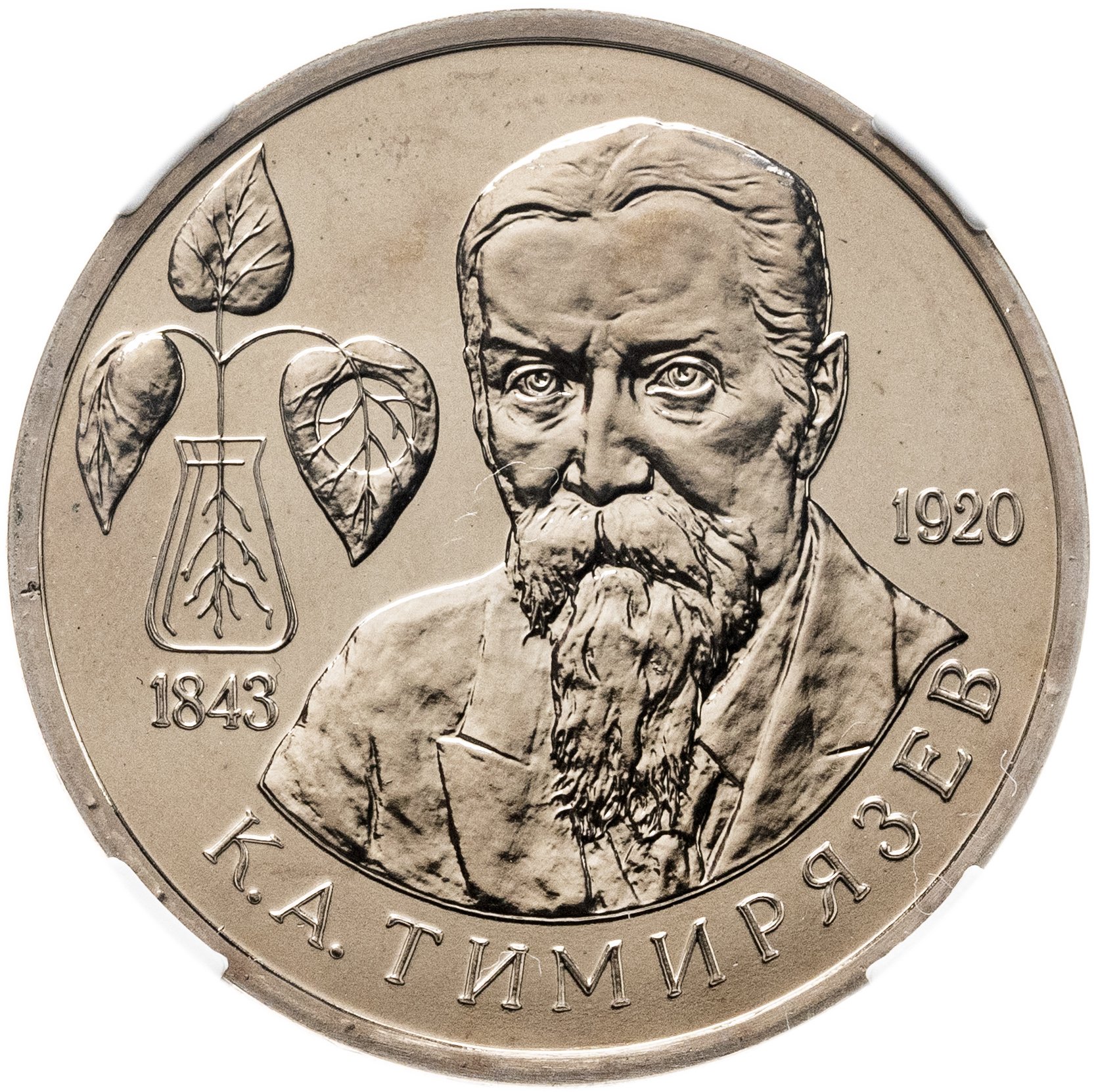купить 1 рубль 1993 ММД 150-летие со дня рождения К.А.Тимирязева в слабе ННР MS67