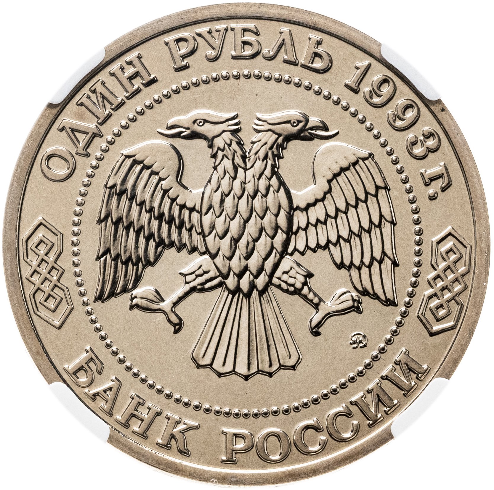 Вверху вдоль канта номинал «ОДИН РУБЛЬ» и год выпуска «1993 г.», внизу слова «БАНК РОССИИ». В середине двуглавый орел под ним справа монограмма монетного двора «ММД».