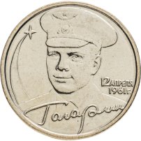 В 2001 году 40-летию первого полёта человека в космос было посвящено несколько монет разных номиналов, и среди них — 2 рубля с изображением портрета Гагарина на реверсе. Если большинство монет с портретом Гагарина представляют его (как жителя космоса) в скафандре, то здесь он — человек Земли, надевший форму и фуражку. На монете не видно звёзд на погонах, однако известно, что в начале подготовки к космическим путешествиям Гагарин значился старшим лейтенантом, а из полёта вернулся уже майором, перескочив звание.