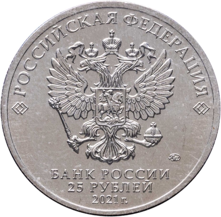 По центру изображен Государственный герб Российской Федерации. Сверху вдоль канта – название страны «РОССИЙСКАЯ ФЕДЕРАЦИЯ», обрамленное с обеих сторон сдвоенными ромбами. Снизу горизонтально надпись в три строки – «БАНК РОССИИ, 25 РУБЛЕЙ, 2021 г.». Под гербом: слева справа товарный знак монетного двора «ММД».