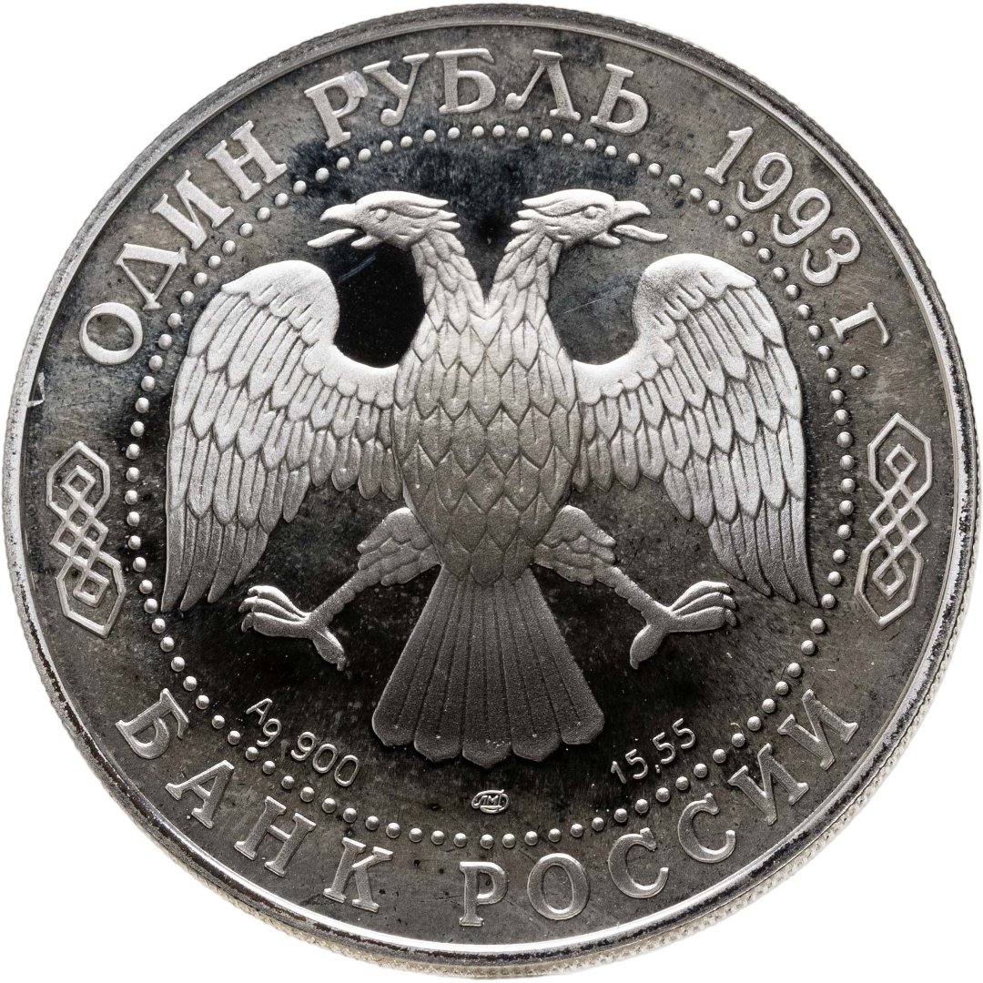 Вверху вдоль канта номинал «1 рубль» и год выпуска «1993 г.», внизу слова «БАНК РОССИИ». В середине в ободке из точек двуглавый орел под ним с внутренней стороны точечного ободка слева химическое название «Ag» и проба «900» металла, далее направо монограмма монетного двора «ЛМД» и чистый вес находящегося в монете драгоценного металла «15,55».