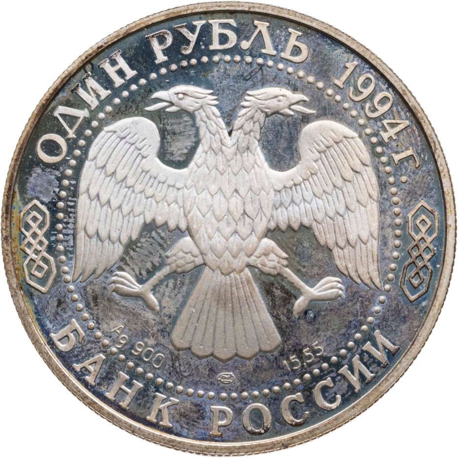 Вверху вдоль канта номинал «1 рубль» и год выпуска «1994 г.», внизу слова «БАНК РОССИИ». В середине в ободке из точек двуглавый орел под ним с внутренней стороны точечного ободка слева химическое название «Ag» и проба «900» металла, далее направо монограмма монетного двора «ЛМД» и чистый вес находящегося в монете драгоценного металла «15,55».
