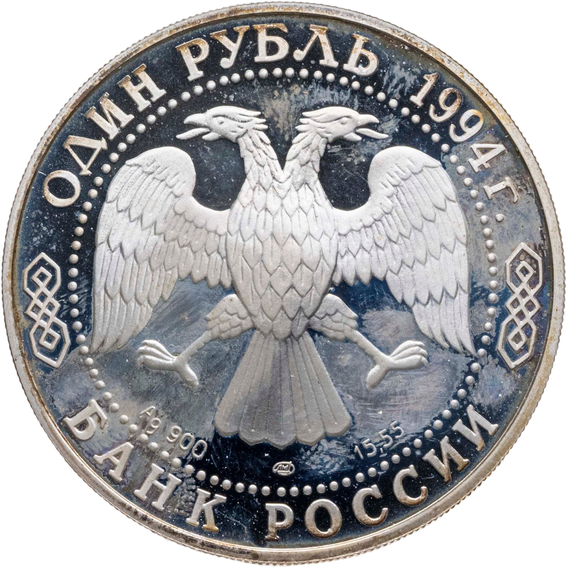Вверху вдоль канта номинал «1 рубль» и год выпуска «1994 г.», внизу слова «БАНК РОССИИ». В середине в ободке из точек двуглавый орел под ним с внутренней стороны точечного ободка слева химическое название «Ag» и проба «900» металла, далее направо монограмма монетного двора «ЛМД» и чистый вес находящегося в монете драгоценного металла «15,55».