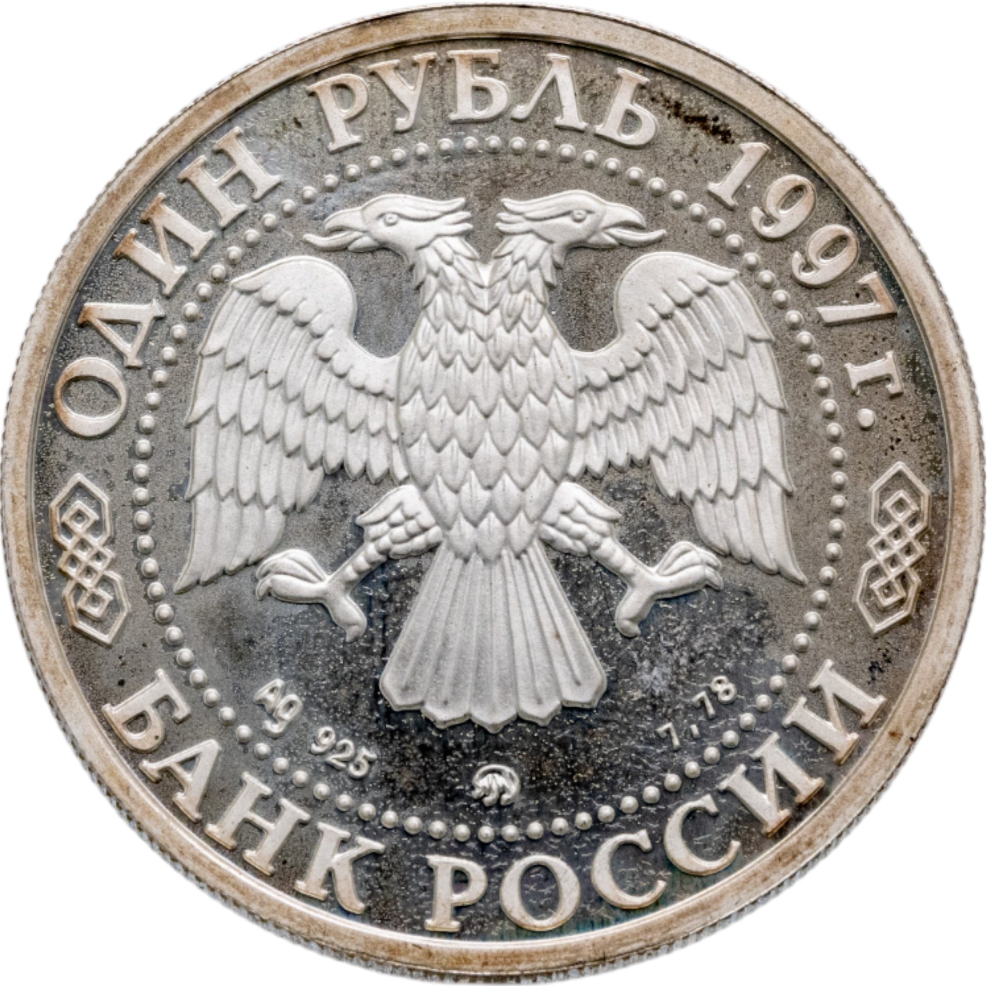 Вверху вдоль канта номинал «1 рубль» и год выпуска «1997 г.», внизу слова «БАНК РОССИИ». В середине в ободке из точек двуглавый орел под ним с внутренней стороны точечного ободка слева химическое название «Ag» и проба «925» металла, далее направо монограмма монетного двора «ММД» и чистый вес находящегося в монете драгоценного металла «7,78».