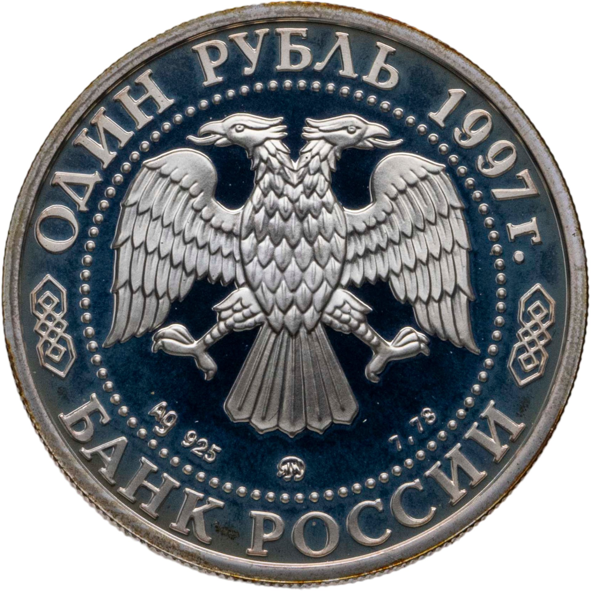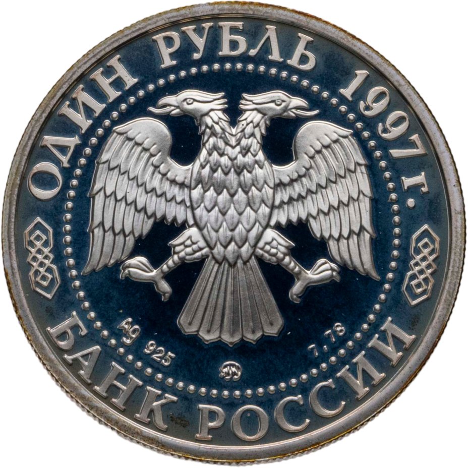 Вверху вдоль канта номинал «1 рубль» и год выпуска «1997 г.», внизу слова «БАНК РОССИИ». В середине в ободке из точек двуглавый орел под ним с внутренней стороны точечного ободка слева химическое название «Ag» и проба «925» металла, далее направо монограмма монетного двора «ММД» и чистый вес находящегося в монете драгоценного металла «7,78».