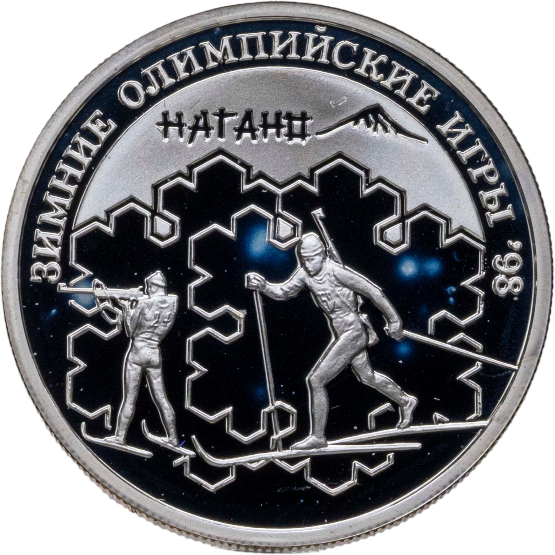 Изображениe двух спортсменов-биатлонистов: одного — в момент лыжной гонки, второго — в момент стрельбы из винтовки, на втором плане — снежная вершина горы Фудзияма. Вверху по кругу надписи: «Зимние олимпийские игры 98», ниже — «Нагано».