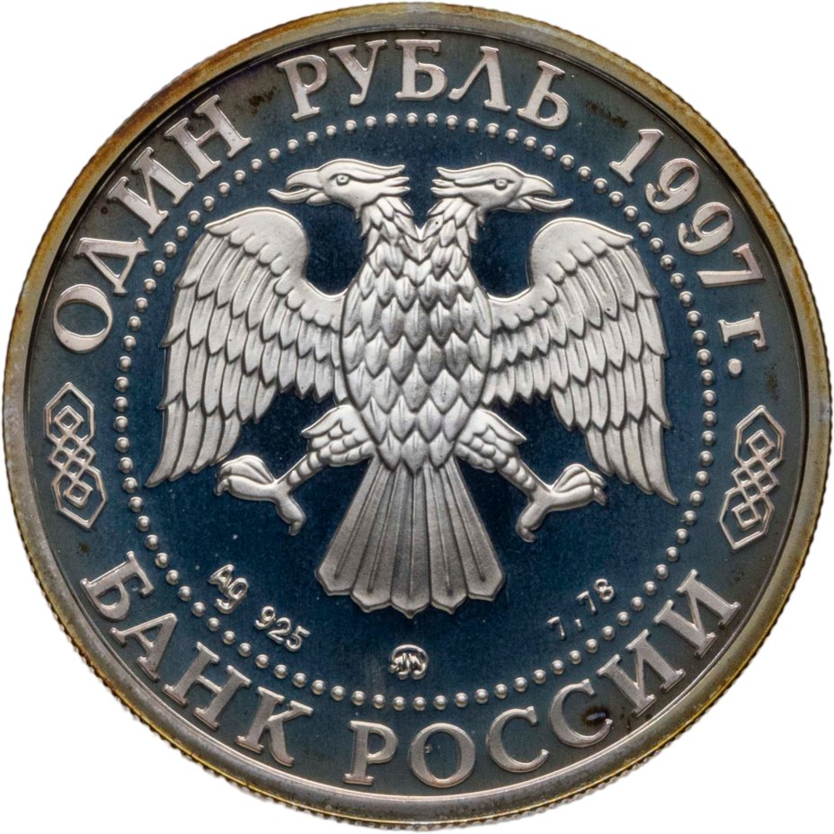 Вверху вдоль канта номинал «1 рубль» и год выпуска «1997 г.», внизу слова «БАНК РОССИИ». В середине в ободке из точек двуглавый орел под ним с внутренней стороны точечного ободка слева химическое название «Ag» и проба «925» металла, далее направо монограмма монетного двора «ММД» и чистый вес находящегося в монете драгоценного металла «7,78».