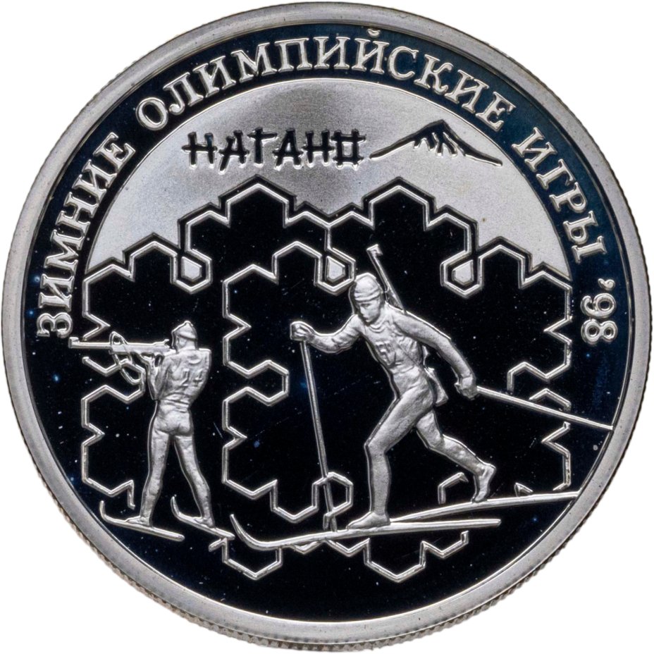 Изображениe двух спортсменов-биатлонистов: одного — в момент лыжной гонки, второго — в момент стрельбы из винтовки, на втором плане — снежная вершина горы Фудзияма. Вверху по кругу надписи: «Зимние олимпийские игры 98», ниже — «Нагано».