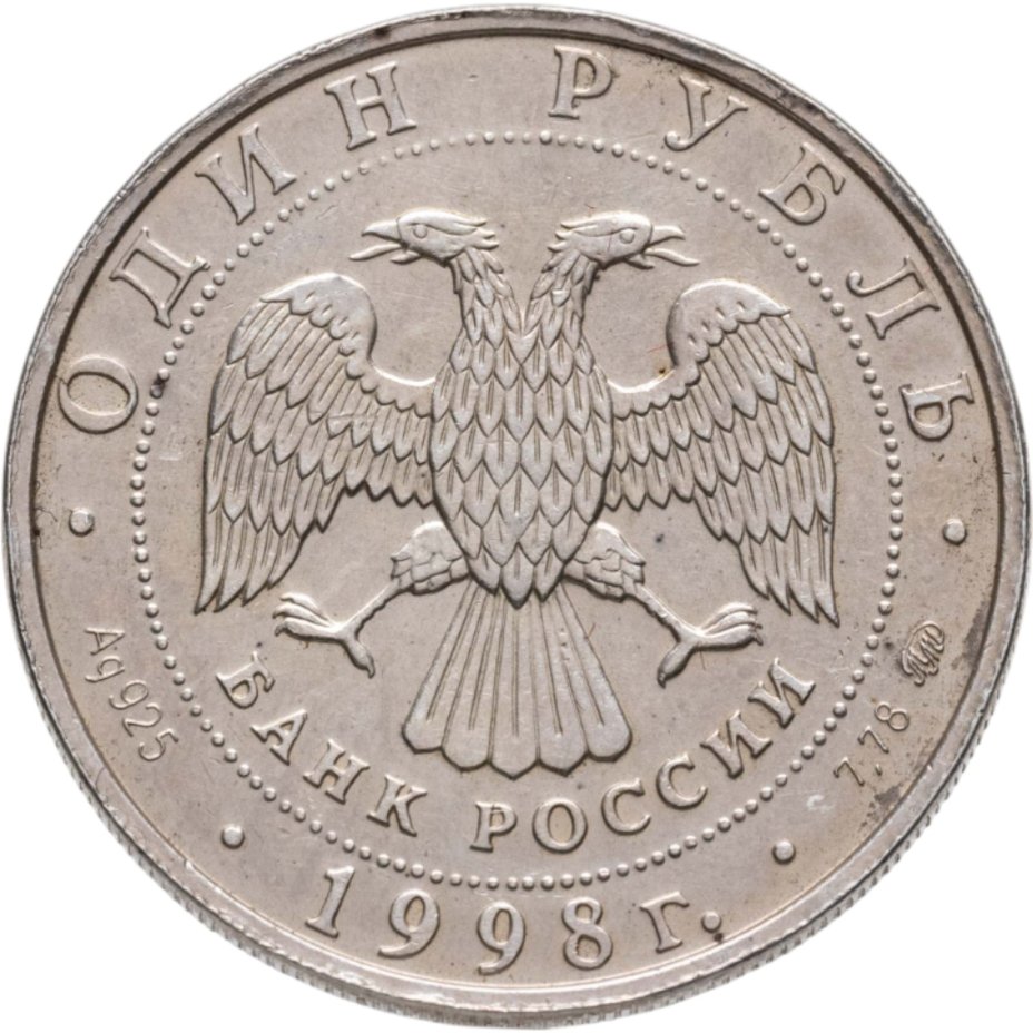 Вверху вдоль канта номинал «ОДИН РУБЛЬ», внизу слева химическое название «Ag» и проба «925» металла, внизу по центру год выпуска «1998 г.», внизу справа чистый вес находящегося в монете драгоценного металла «7,78» и монограмма монетного двора «ММД». В середине в ободке из точек двуглавый орел под ним с внутренней стороны точечного ободка слова «БАНК РОССИИ».
