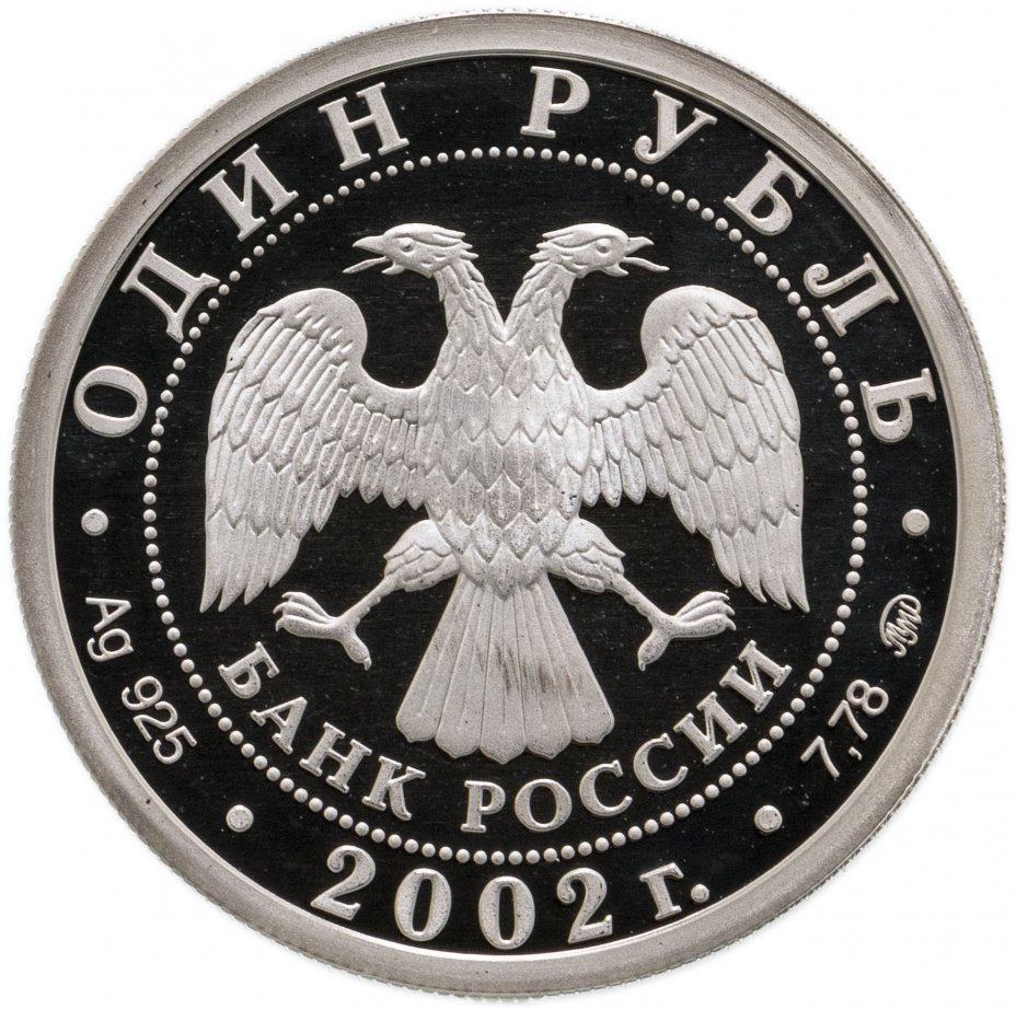 Вверху вдоль канта номинал «ОДИН РУБЛЬ», внизу слева химическое название «Ag» и проба «925» металла, внизу по центру год выпуска «2002 г.», внизу справа чистый вес находящегося в монете драгоценного металла «7,78» и монограмма монетного двора «ММД». В середине в ободке из точек двуглавый орел под ним с внутренней стороны точечного ободка слова «БАНК РОССИИ».
