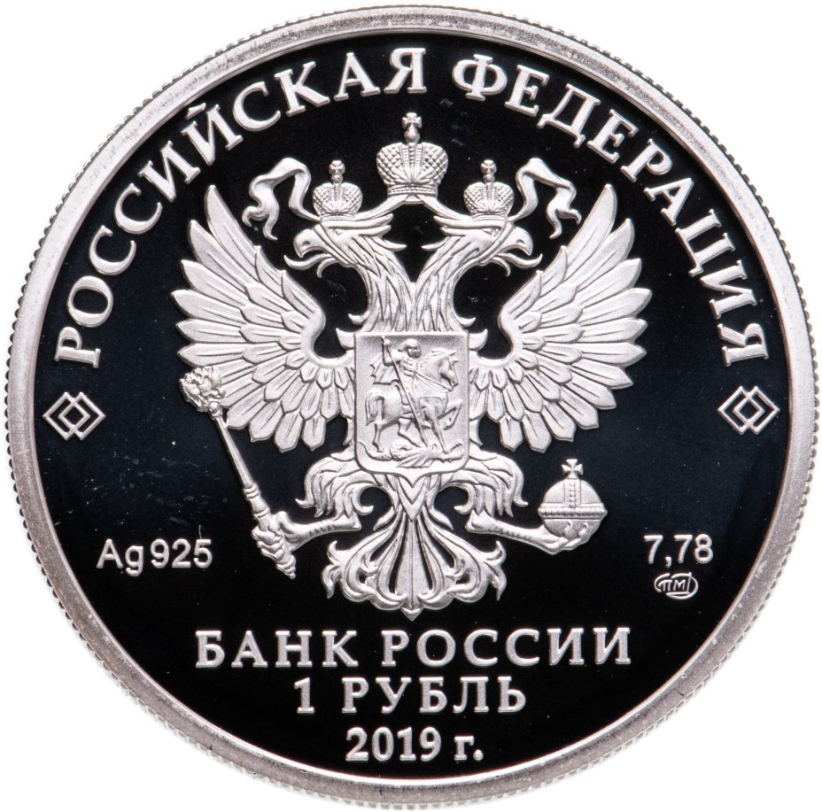 По центру изображен Государственный герб Российской Федерации, сверху вдоль канта – название страны «РОССИЙСКАЯ ФЕДЕРАЦИЯ», обрамленное с обеих сторон сдвоенными ромбами. Снизу горизонтально надпись в три строки – «БАНК РОССИИ, 1 РУБЛЬ, 2019 г.». Под гербом: слева – обозначения драгоценного металла и пробы сплава «Ag925», справа – содержание химически чистого металла и товарный знак монетного двора «7,78 СПМД».