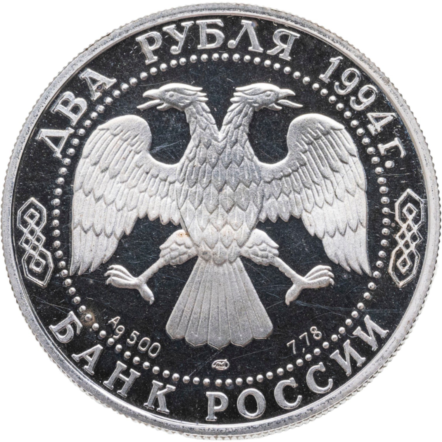 Вверху вдоль канта номинал «2 рубля» и год выпуска «1994 г.», внизу слова «БАНК РОССИИ». В середине в ободке из точек двуглавый орел под ним с внутренней стороны точечного ободка слева химическое название «Ag» и проба «500» металла, далее направо монограмма монетного двора «ЛМД» и чистый вес находящегося в монете драгоценного металла «7,78».