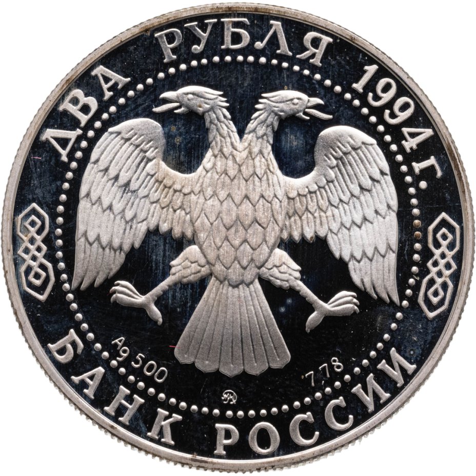 Вверху вдоль канта номинал «2 рубля» и год выпуска «1994 г.», внизу слова «БАНК РОССИИ». В середине в ободке из точек двуглавый орел под ним с внутренней стороны точечного ободка слева химическое название «Ag» и проба «500» металла, далее направо монограмма монетного двора «ЛМД» и чистый вес находящегося в монете драгоценного металла «7,78».