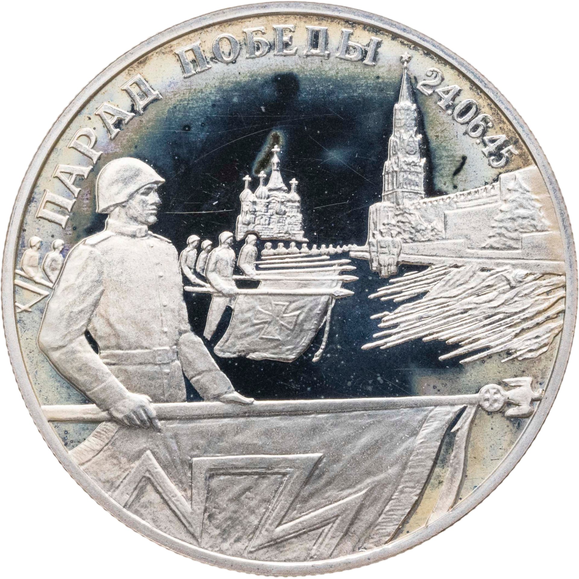 Изображение советских солдат, бросающих флаги фашистской Германии к Кремлёвской стене во время Парада Победы на Красной площади в Москве, вверху по окружности - надпись: "ПАРАД ПОБЕДЫ 24.06.45".