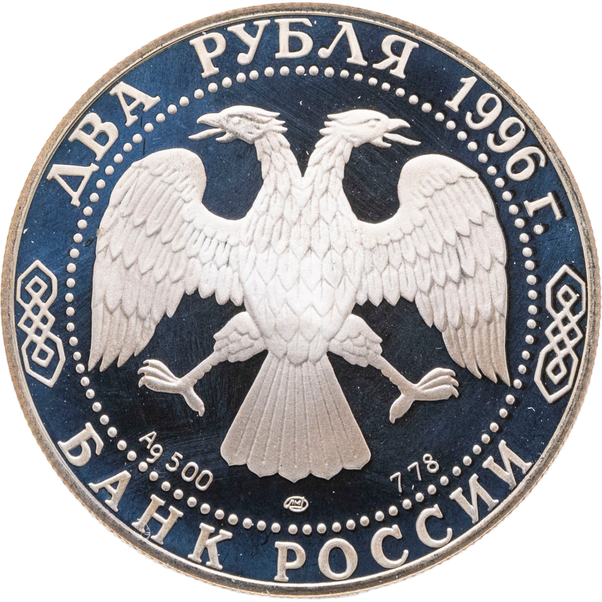 Вверху вдоль канта номинал «2 рубля» и год выпуска «1996 г.», внизу слова «БАНК РОССИИ». В середине в ободке из точек двуглавый орел под ним с внутренней стороны точечного ободка слева химическое название «Ag» и проба «500» металла, далее направо монограмма монетного двора «ЛМД» и чистый вес находящегося в монете драгоценного металла «7,78».