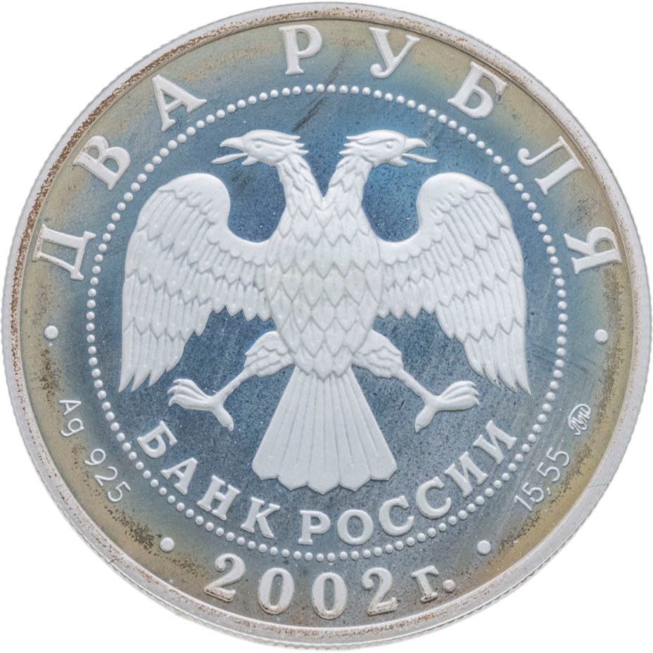 Вверху вдоль канта номинал «ДВА РУБЛЯ», внизу слева химическое название «Ag» и проба «925» металла, внизу по центру год выпуска «2002 г.», внизу справа чистый вес находящегося в монете драгоценного металла «15,55» и монограмма монетного двора «ММД». В середине в ободке из точек двуглавый орел под ним с внутренней стороны точечного ободка слова «БАНК РОССИИ».