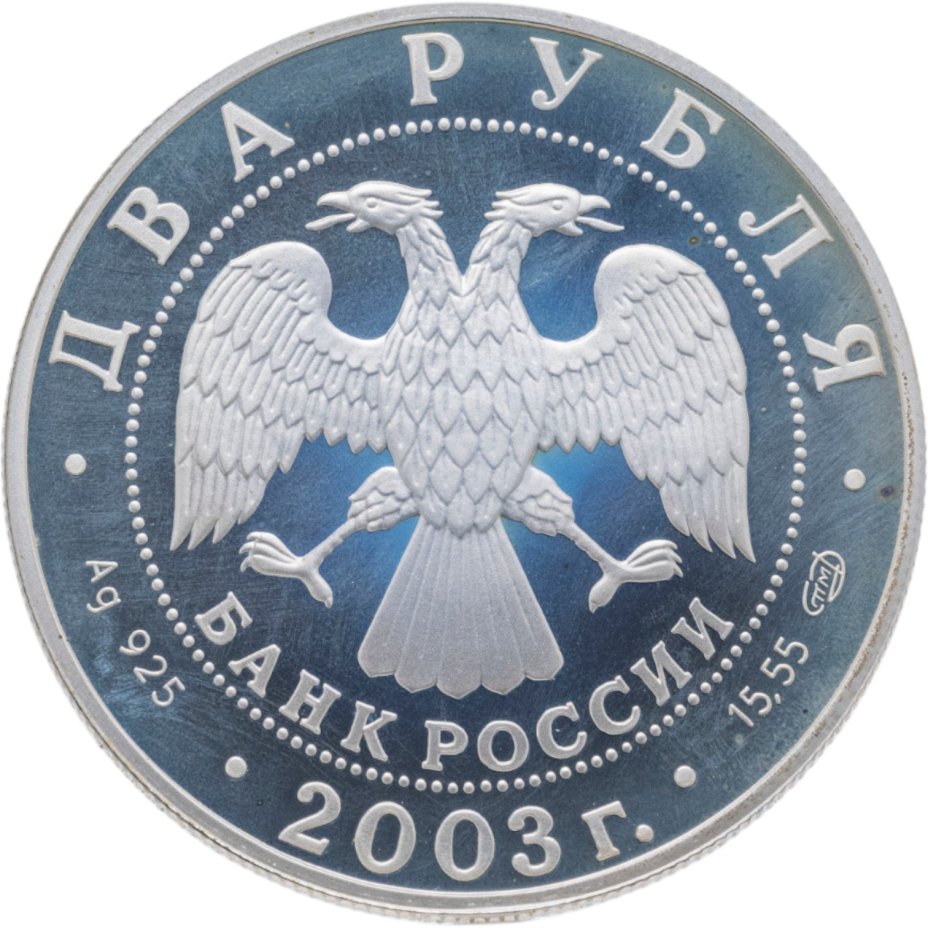 Вверху вдоль канта номинал «ДВА РУБЛЯ», внизу слева химическое название «Ag» и проба «925» металла, внизу по центру год выпуска «2002 г.», внизу справа чистый вес находящегося в монете драгоценного металла «15,55» и монограмма монетного двора «ММД». В середине в ободке из точек двуглавый орел под ним с внутренней стороны точечного ободка слова «БАНК РОССИИ».