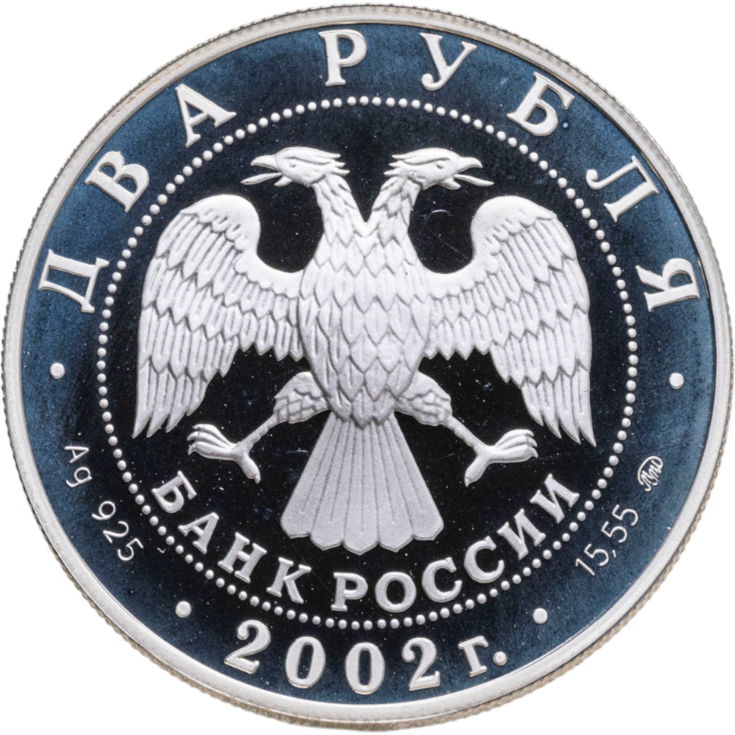 Вверху вдоль канта номинал «ДВА РУБЛЯ», внизу слева химическое название «Ag» и проба «925» металла, внизу по центру год выпуска «2002 г.», внизу справа чистый вес находящегося в монете драгоценного металла «15,55» и монограмма монетного двора «ММД». В середине в ободке из точек двуглавый орел под ним с внутренней стороны точечного ободка слова «БАНК РОССИИ».