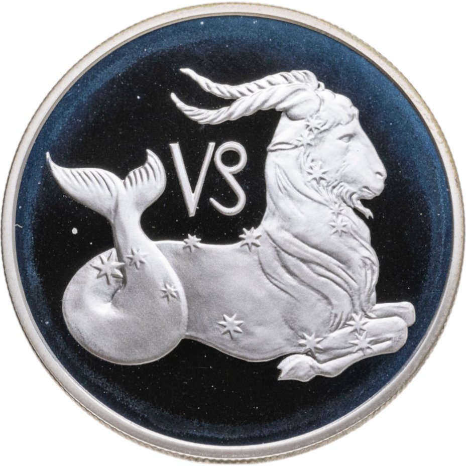 Изображение козерога на фоне звёзд, над ним - знак зодиакального созвездия Козерога.