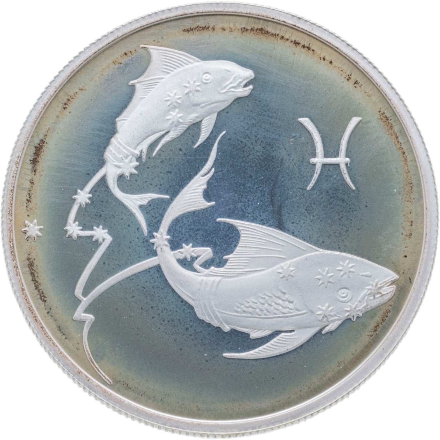 Изображения двух рыб на фоне звeзд, справа - знак зодиакального созвездия Рыбы.