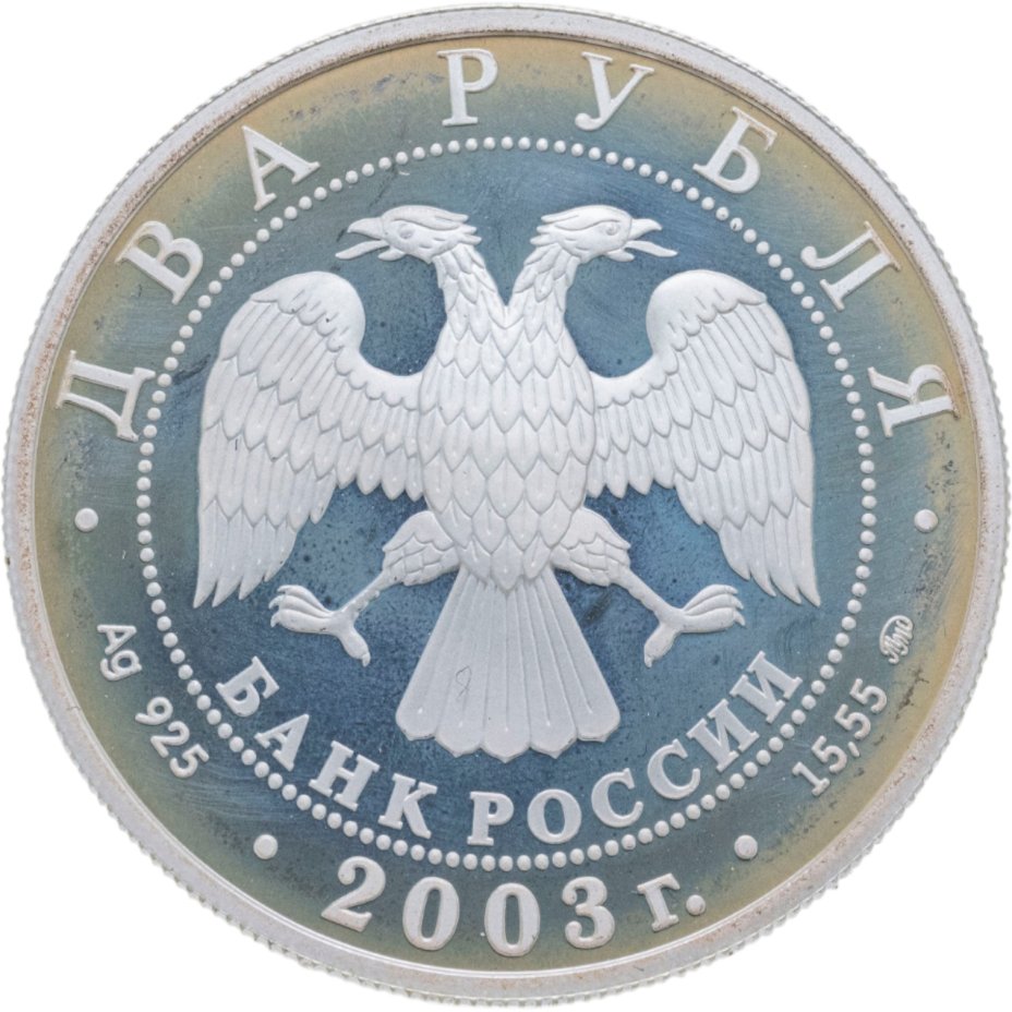 Вверху вдоль канта номинал «ДВА РУБЛЯ», внизу слева химическое название «Ag» и проба «925» металла, внизу по центру год выпуска «2003 г.», внизу справа чистый вес находящегося в монете драгоценного металла «15,55» и монограмма монетного двора «ММД». В середине в ободке из точек двуглавый орел под ним с внутренней стороны точечного ободка слова «БАНК РОССИИ».