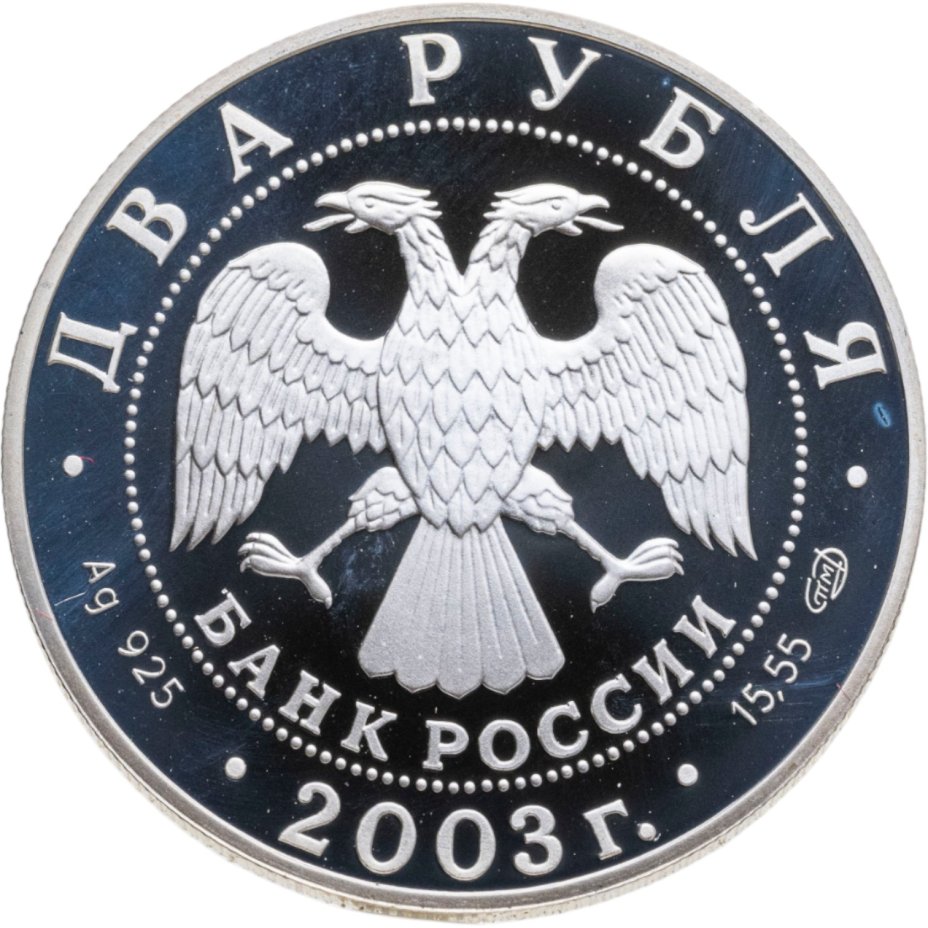 Вверху вдоль канта номинал «ДВА РУБЛЯ», внизу слева химическое название «Ag» и проба «925» металла, внизу по центру год выпуска «2003 г.», внизу справа чистый вес находящегося в монете драгоценного металла «15,55» и монограмма монетного двора «СПМД». В середине в ободке из точек двуглавый орел под ним с внутренней стороны точечного ободка слова «БАНК РОССИИ».